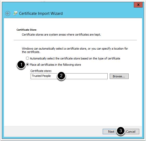 1. Select the "Place all certificates in the following store" option