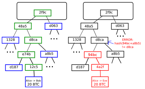 A Merkle tree is a binary tree where the parent contains the hash of the concatenation of the hashes of the two children. This explains the integrity property: any change in a data block results in a change of the root node. With just a little bit of meta-data (uncles and parents, which can be untrusted) and a trusted root node, we can verify the validity of the block.