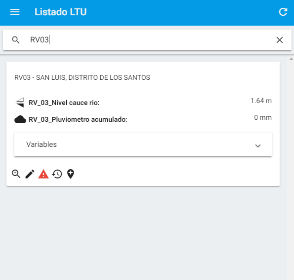 Al hacer click en una LTU se visualizará el listado de variables principales. Siempre se visualizará en formato reducido. También se puede consultar el listado de todas las variables y las alarmas de dicha LTU.