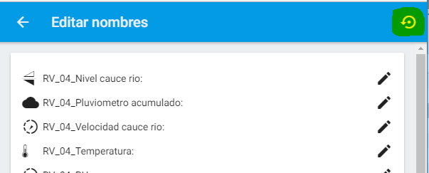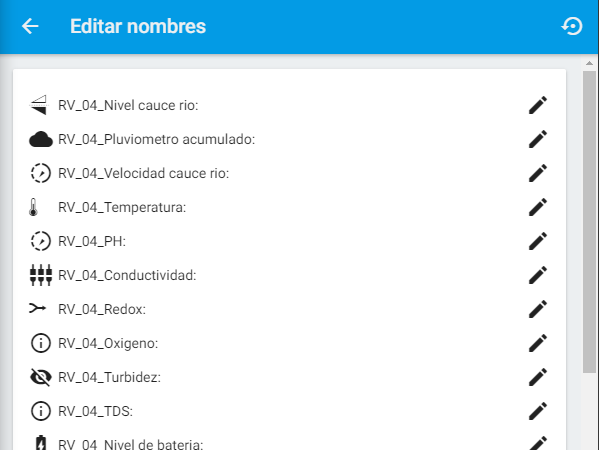 Se listan todas las variables (Incluidas las alarmas) y se puede editar su nombre haciendo click en el icono
