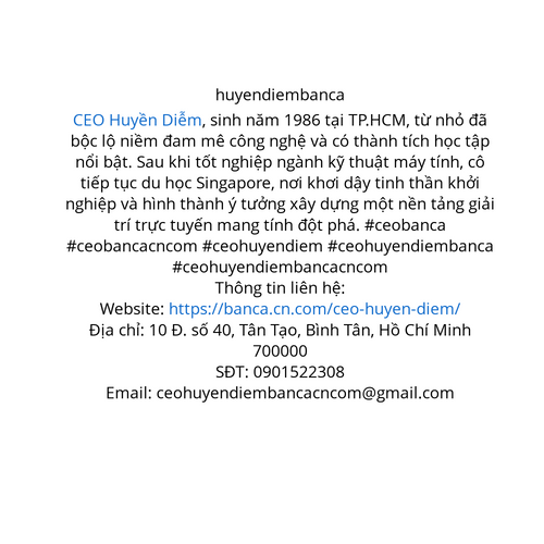 "CEO Huyền Diễm, sinh năm 1986 tại TP.HCM, từ nhỏ đã bộc lộ niềm đam mê công nghệ và có thành tích học tập nổi bật. Sau khi tốt nghiệp ngành kỹ thuật máy tính, cô tiếp tục du học Singapore, nơi khơi dậy tinh thần khởi nghiệp và hình thành ý tưởng xây