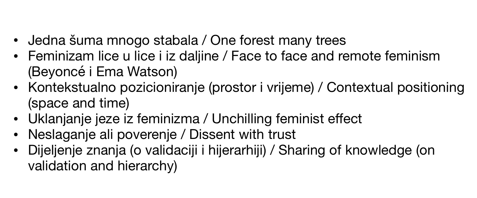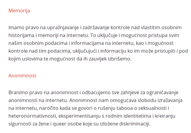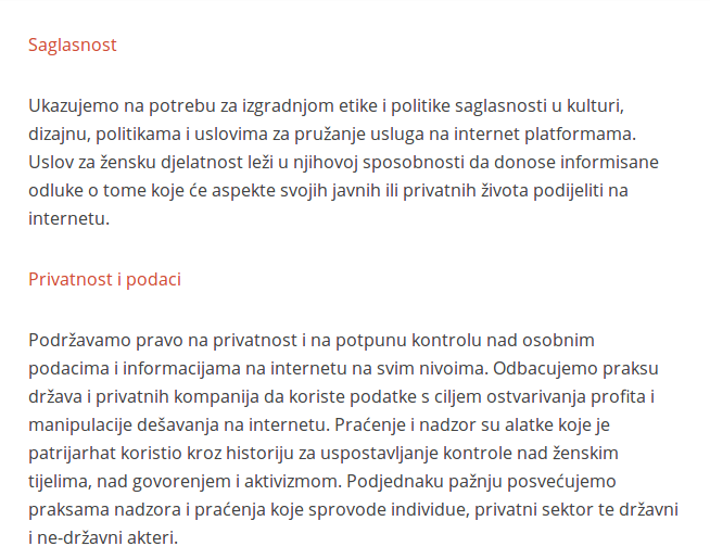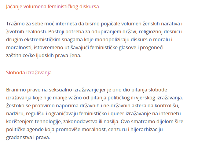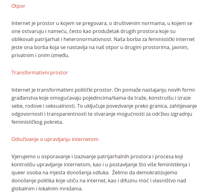 feminizam koji je otvoreni, kontinuirani i transformirajući pokret individualne i kolektivne slobode. Feminizam koji stavlja tačku na strah, nemoć, omalovažavanje, osuđivanje i nasilje a prepoznaje se u svim različitostima. Feminizam koji aktivno radi na dekonstrukciji patrijarhata. Feminizam koji je produžetak, odraz i nastavak naših pokreta i otpora na drugim poljima, kako privatnim tako i javnim.