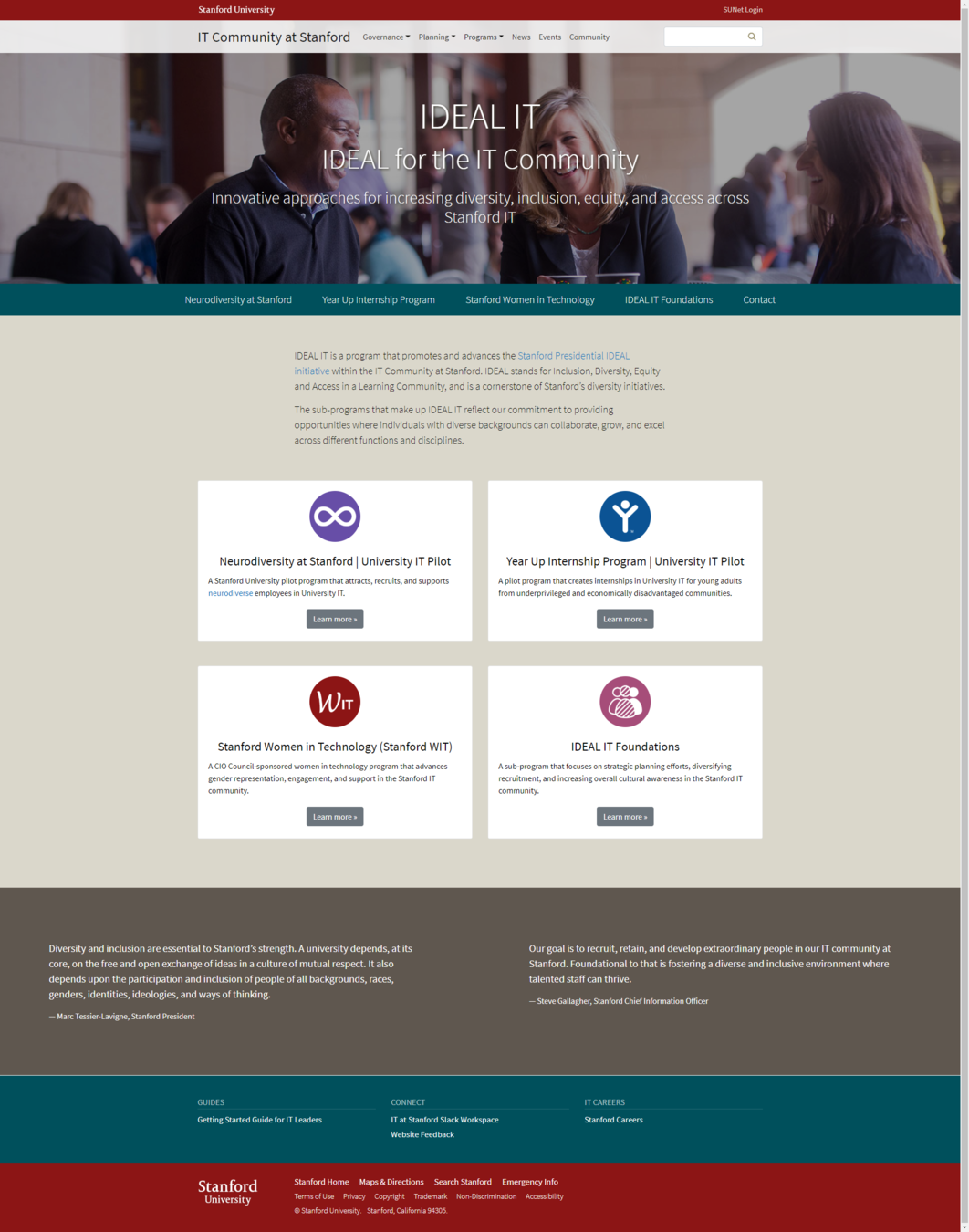 <p class="card-text">IDEAL IT is a program that promotes diversity and inclusion and advances the Stanford Presidential IDEAL initiative within the IT Community at Stanford.</p>