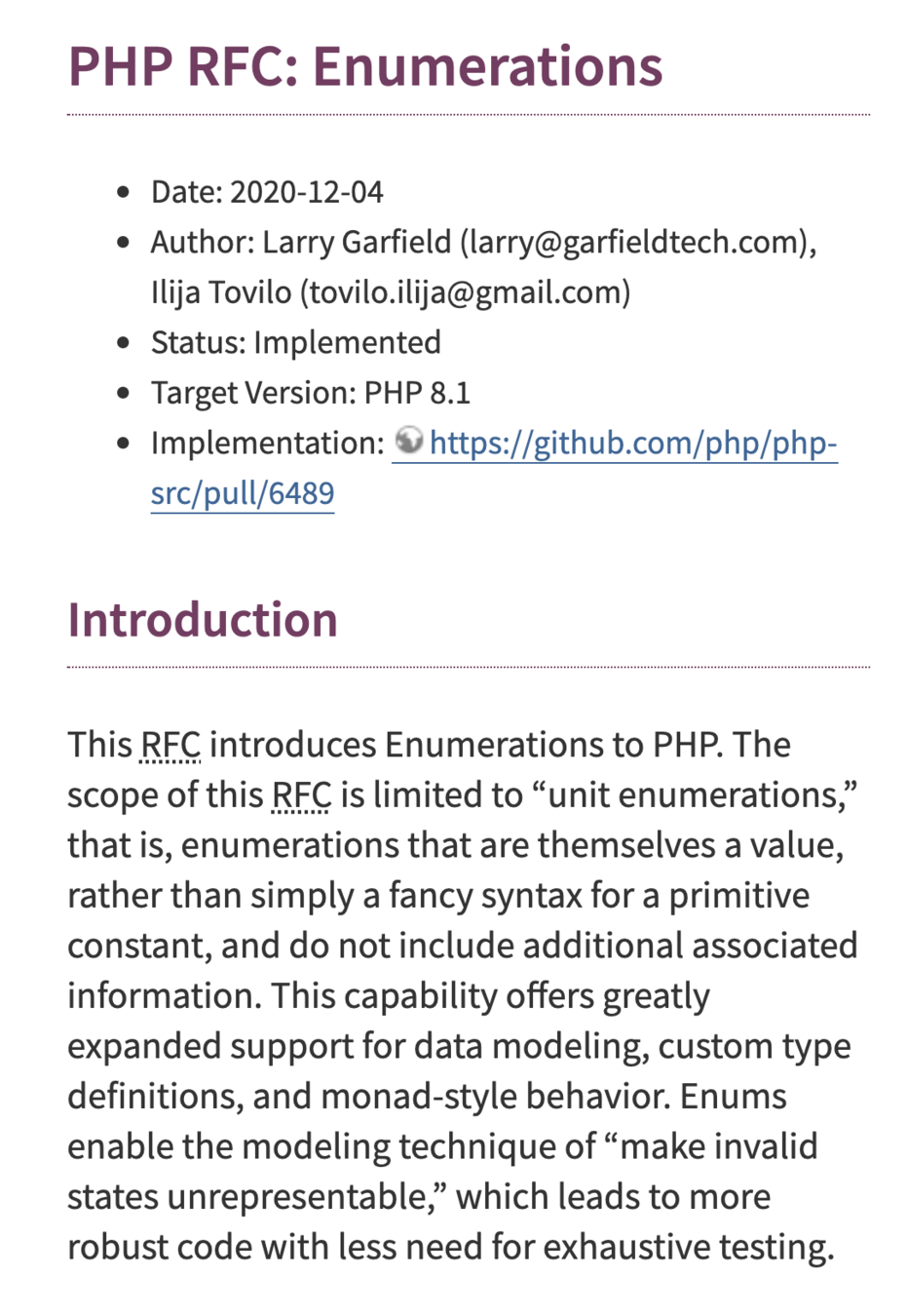 이 기능은 데이터 모델링, 사용자 정의 유형 정의 및 모나드 스타일 동작에 대한 크게 확장 된 지원을 제공합니다. 열거형은 "잘못된 상태를 표현할 수 없게 만드는"모델링 기술을 가능하게하여 철저한 테스트의 필요성을 줄이면서 더 강력한 코드를 만듭니다.(feat 구글 번역)