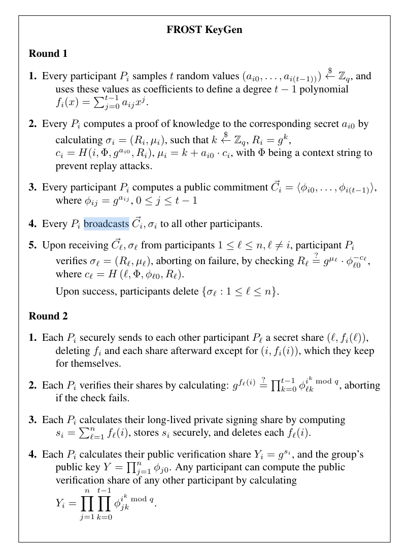 - Every signer generates \(n\) shares and computes a VSS commitment to the shares. (VSS: verifiable secret sharing)