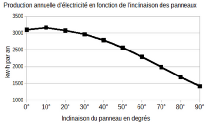 Quel angle d’inclinaison du panneau photovoltaïque donne une production d'énergie électrique minimale ?Quelle est la puissance obtenue ?
