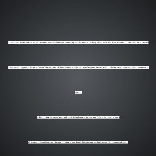 1) Introduction to the problem: existing wearable sensor-technologies, addressing specific markets (activity, sleep, heart rate, blood pressure...); limitations (e.g., just reporting)2) Your solution/