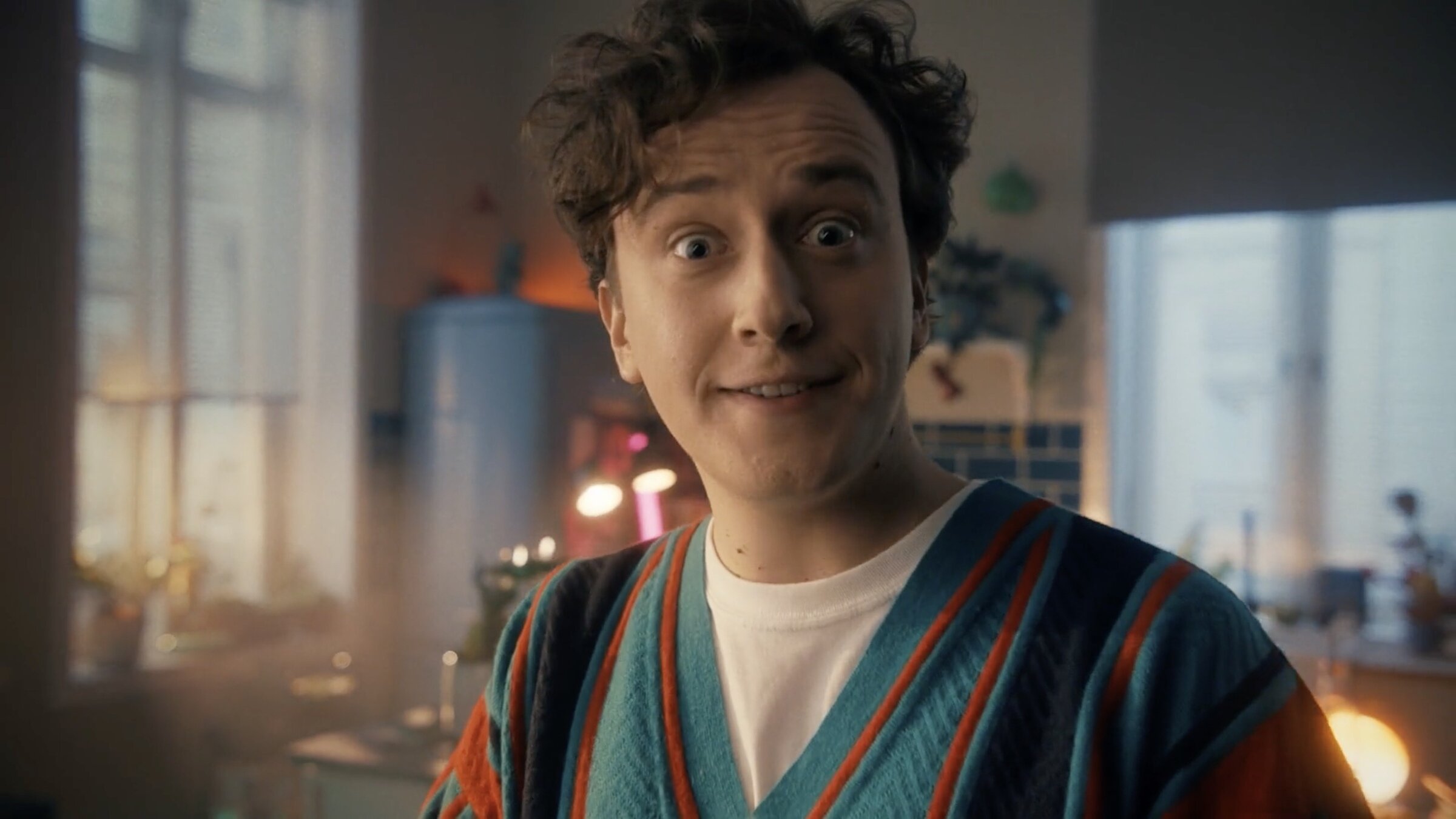 Y vamos a hacerlo en un código de sitcom, con sus risas enlatadas, su estilo de rodaje multicámara, su narrativa visual televisiva clásica, con planos exteriores de situación animados con riffs de guitarra...
