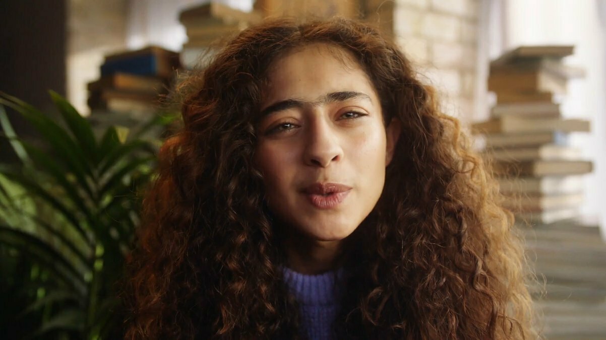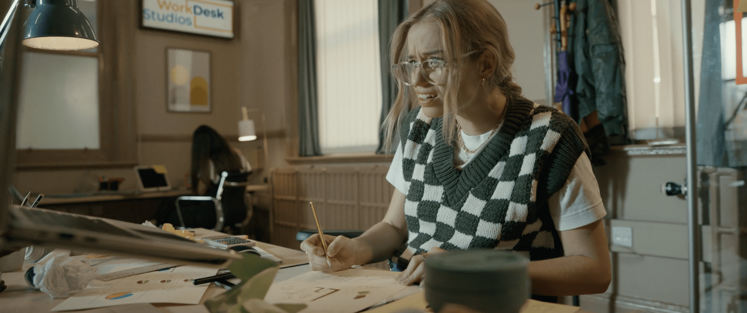 Pasamos ver un plano medio-corto del hermano que mira molesto, retador, a su hermana, a la que vemos en escorzo, y le dedica el famoso gesto de gran mosqueo que popularizaron los hermanos Geller.