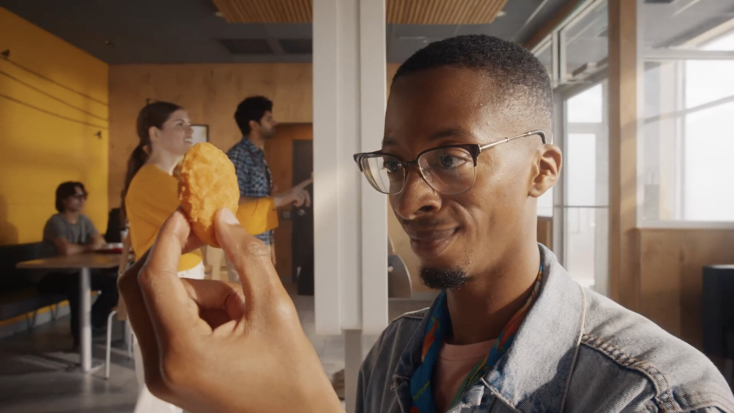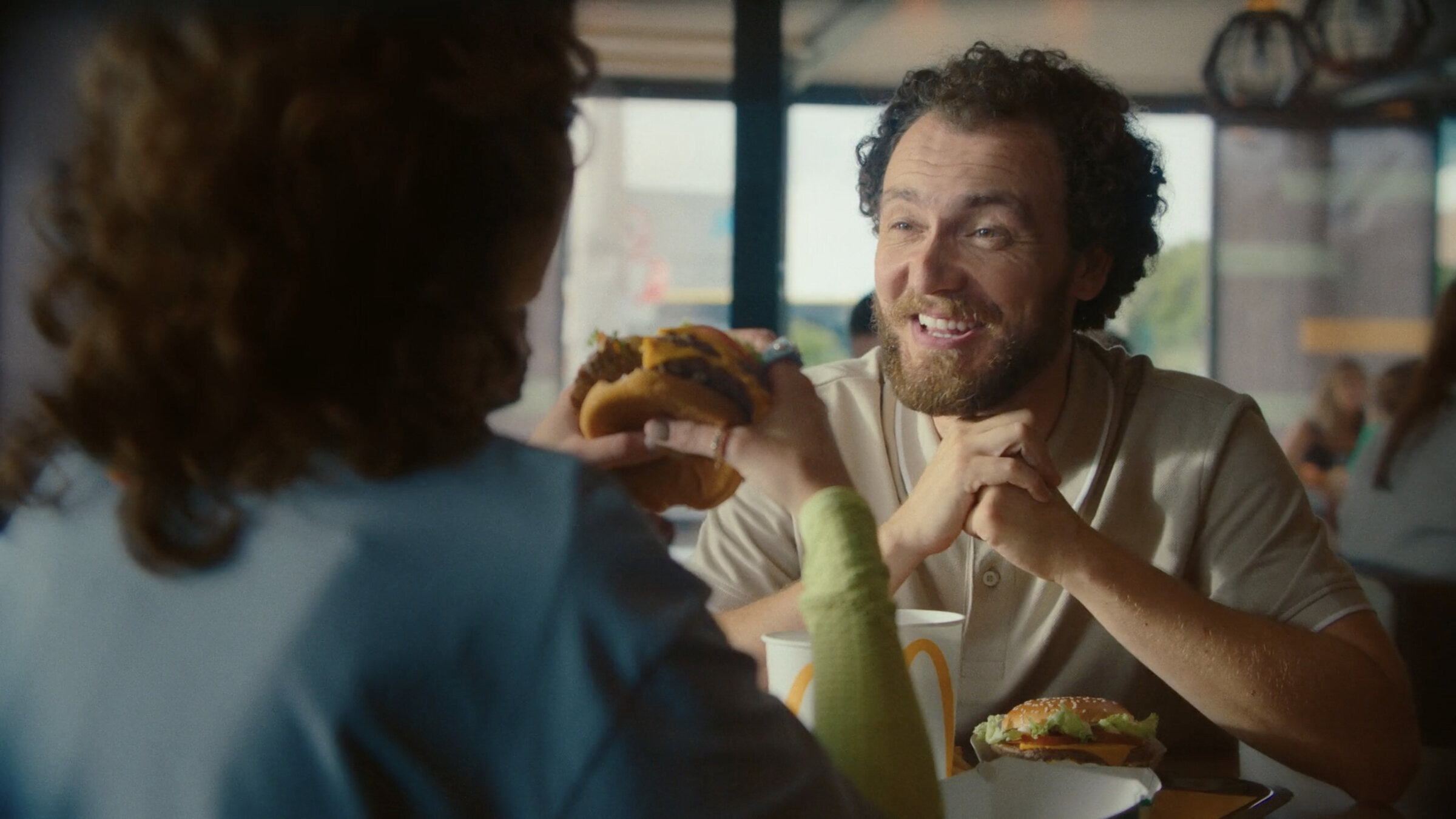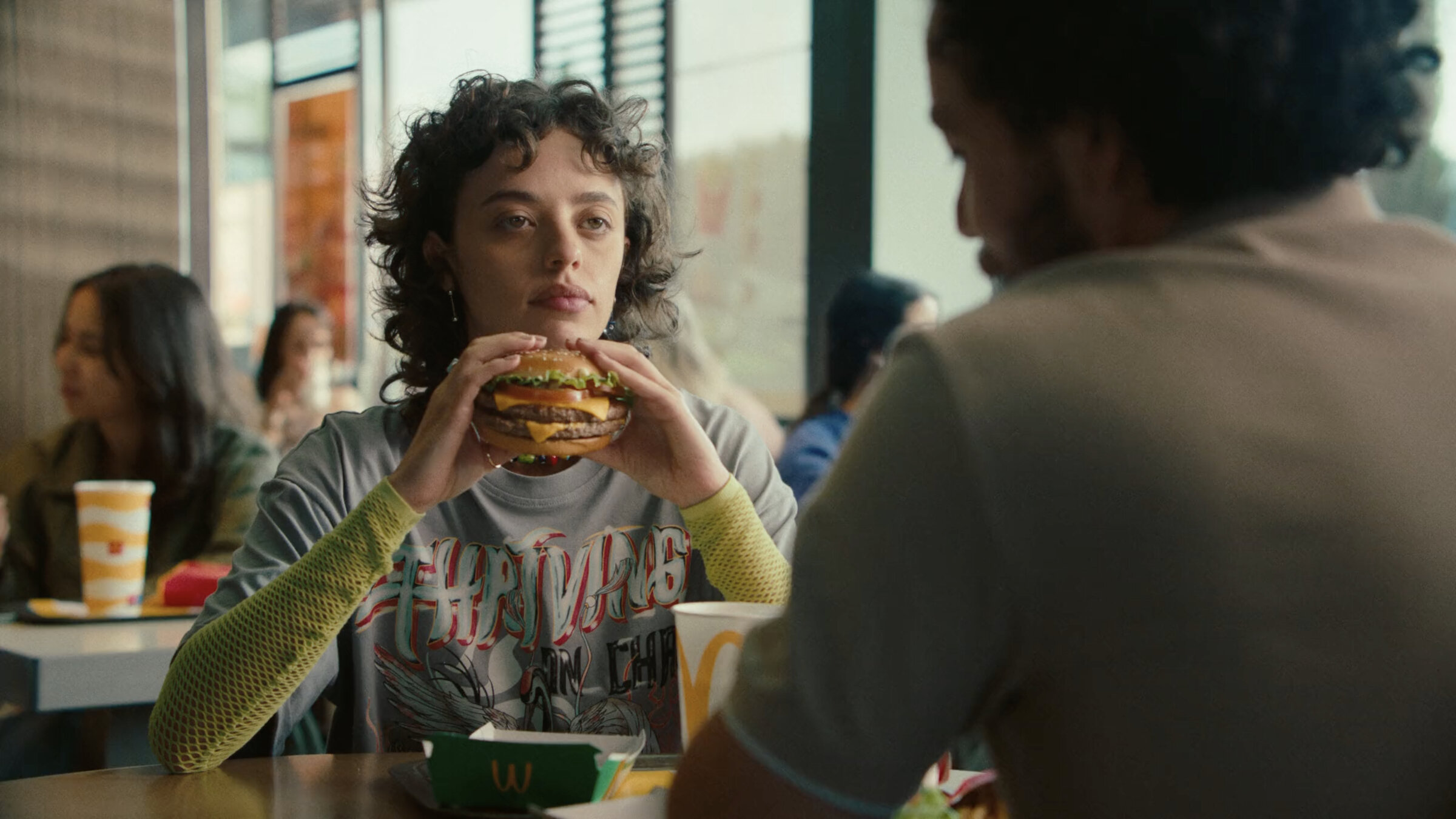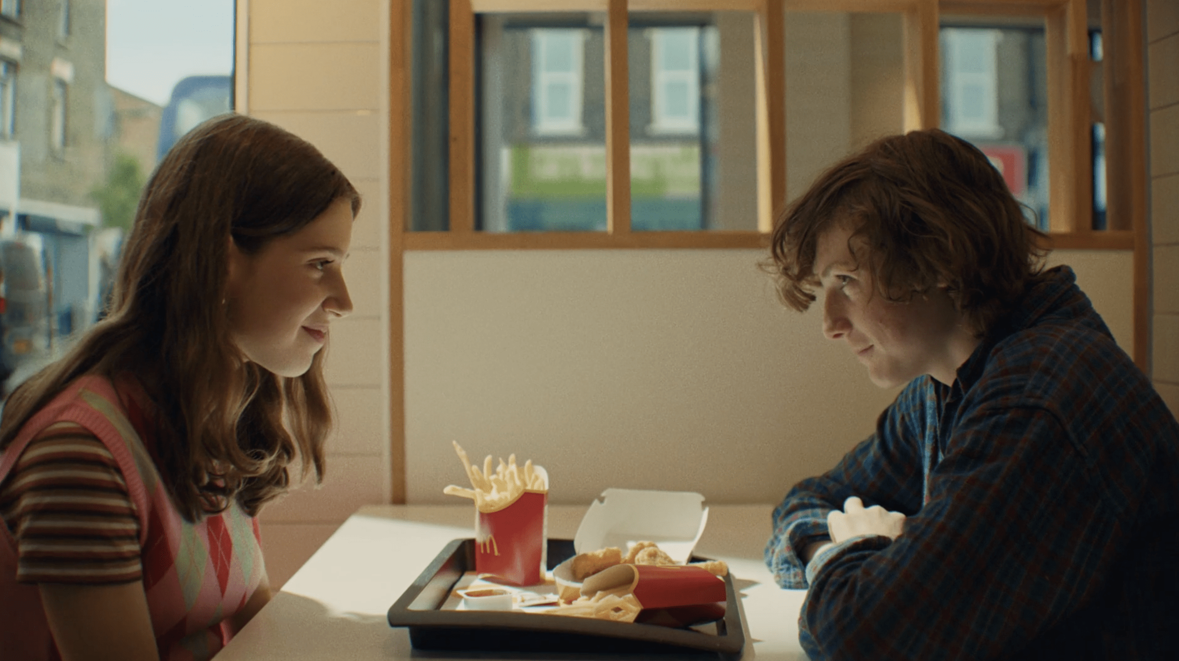 Dentro del código de sitcom en el que nos movemos, vamos a arrancar la historia con un plano de situación como los que se utilizaban en FRIENDS: un plano exterior de la cristalera con la atención centrada en el logo del ventanal, y en el que entrevemos el interior. El logo nos recuerda a primera vista al del CENTRAL PERK pero rápidamente nos sorprende una gran diferencia, pone: CENTRAL McDONALDS. Suena un riff de guitarra pop rock de los 90 muy de género sitcom.