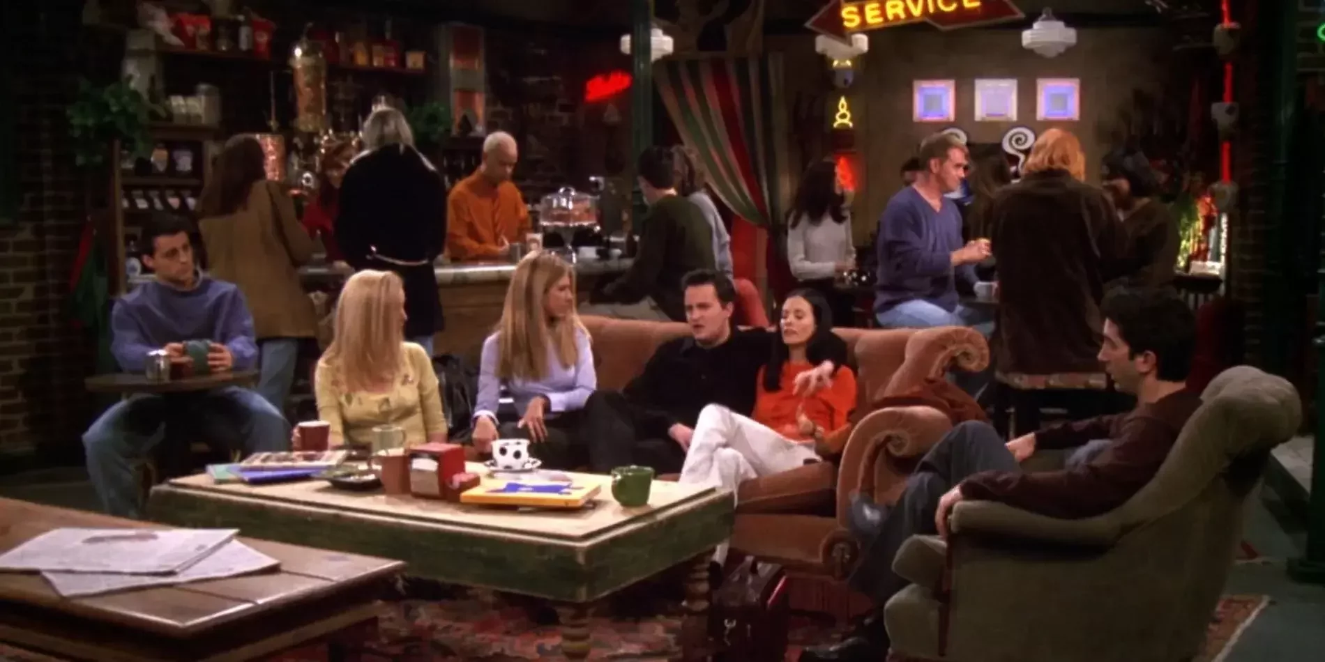 Por corte, o incluso por un breve fundido como acostumbraban a hacer los montadores de Friends en ciertos momentos, pasamos al interior del local. La cámara nos muestra a un grupo de seis amigos sentados muy cómodamente repartidos entre un sofá, un sillón y una silla.Nuestra Mónica parece estar contando algo muy práctico pero poco interesante para Joey, que se entretiene jugando a las miraditas con una chica que espera su McMenú en la barra.