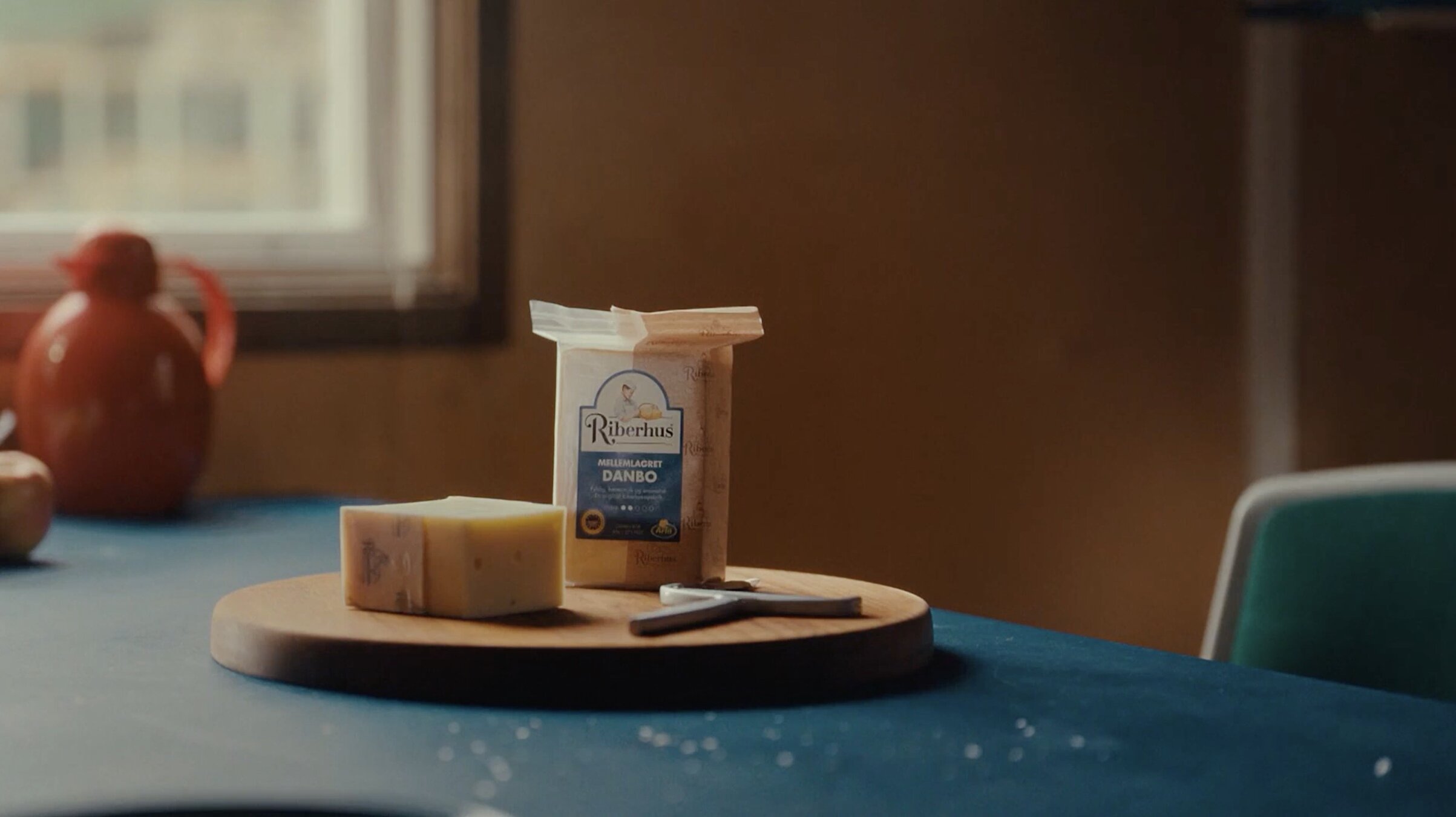 Un espacio luminoso, neutro, con entrada de luz natural, cálido y funcional, un espacio real presidido por una larga mesa provista de diferentes platitos con muestras de producto: queso, yogures, fruta... La mesa podría ser azul.