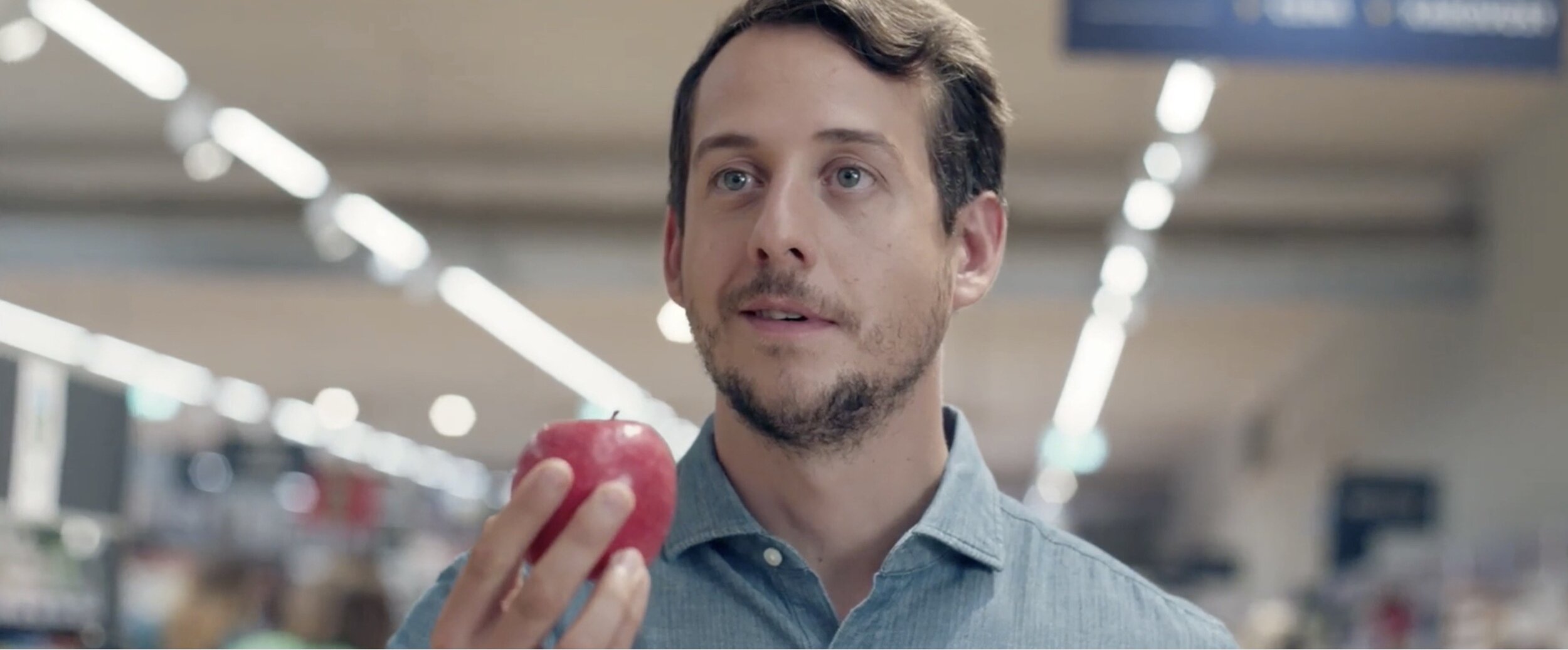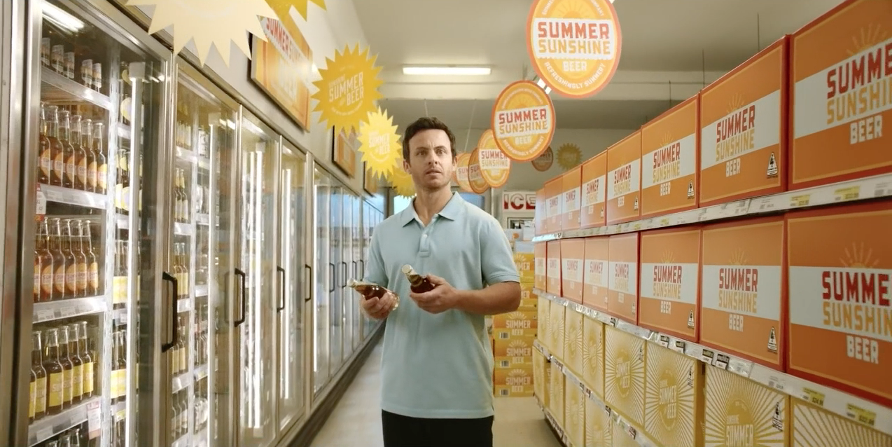 Arranca el spot con un plano de situación aéreo. Vemos el exterior de un supermercado ALDI, y a un grupo de gente que se ha reunido cerca de la entrada. Un arranque que nos da calidad de producción ya de saque, y que aporta a la historia ese toque tan agradecido de narrativa cinematográfica.