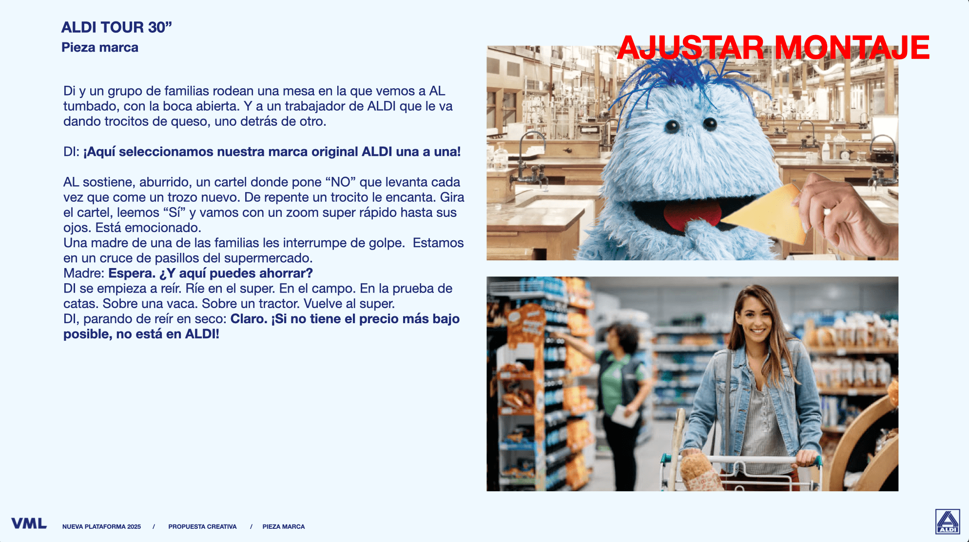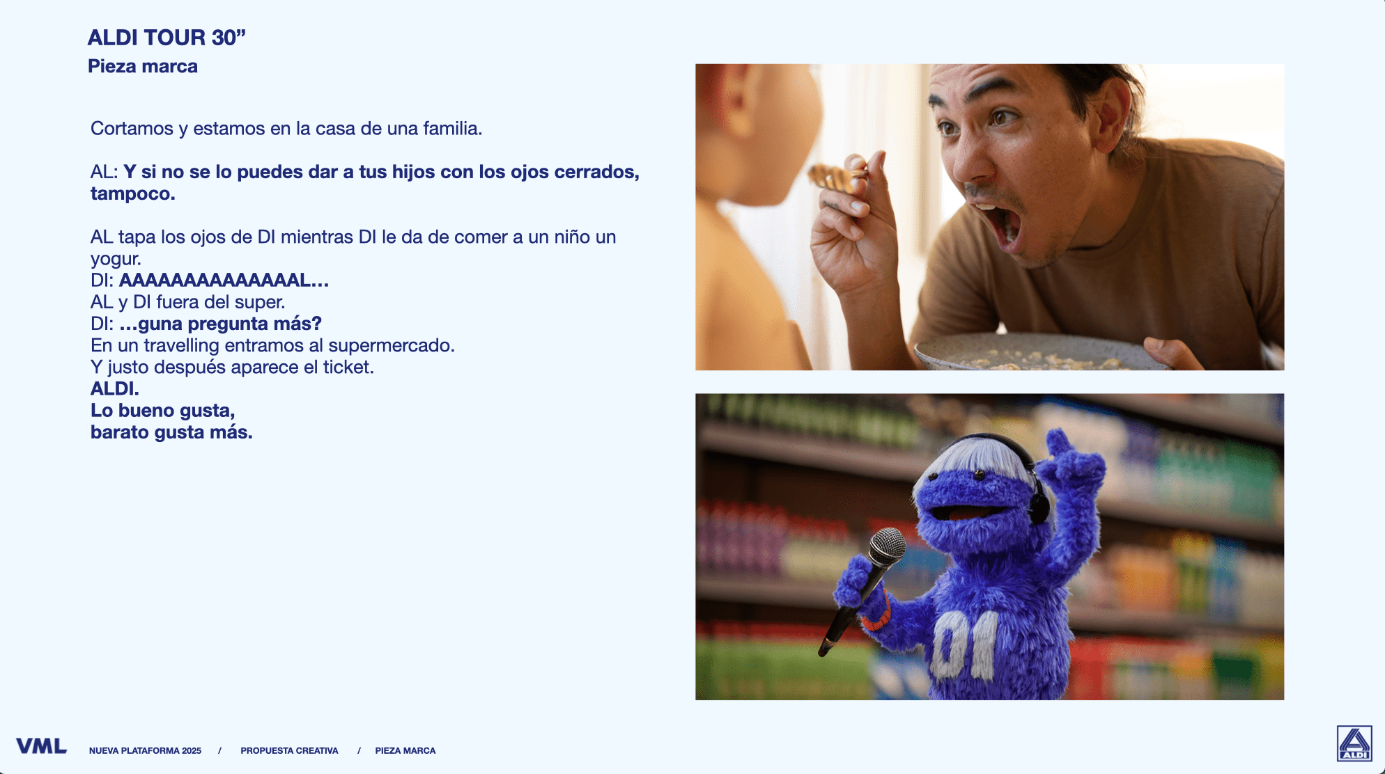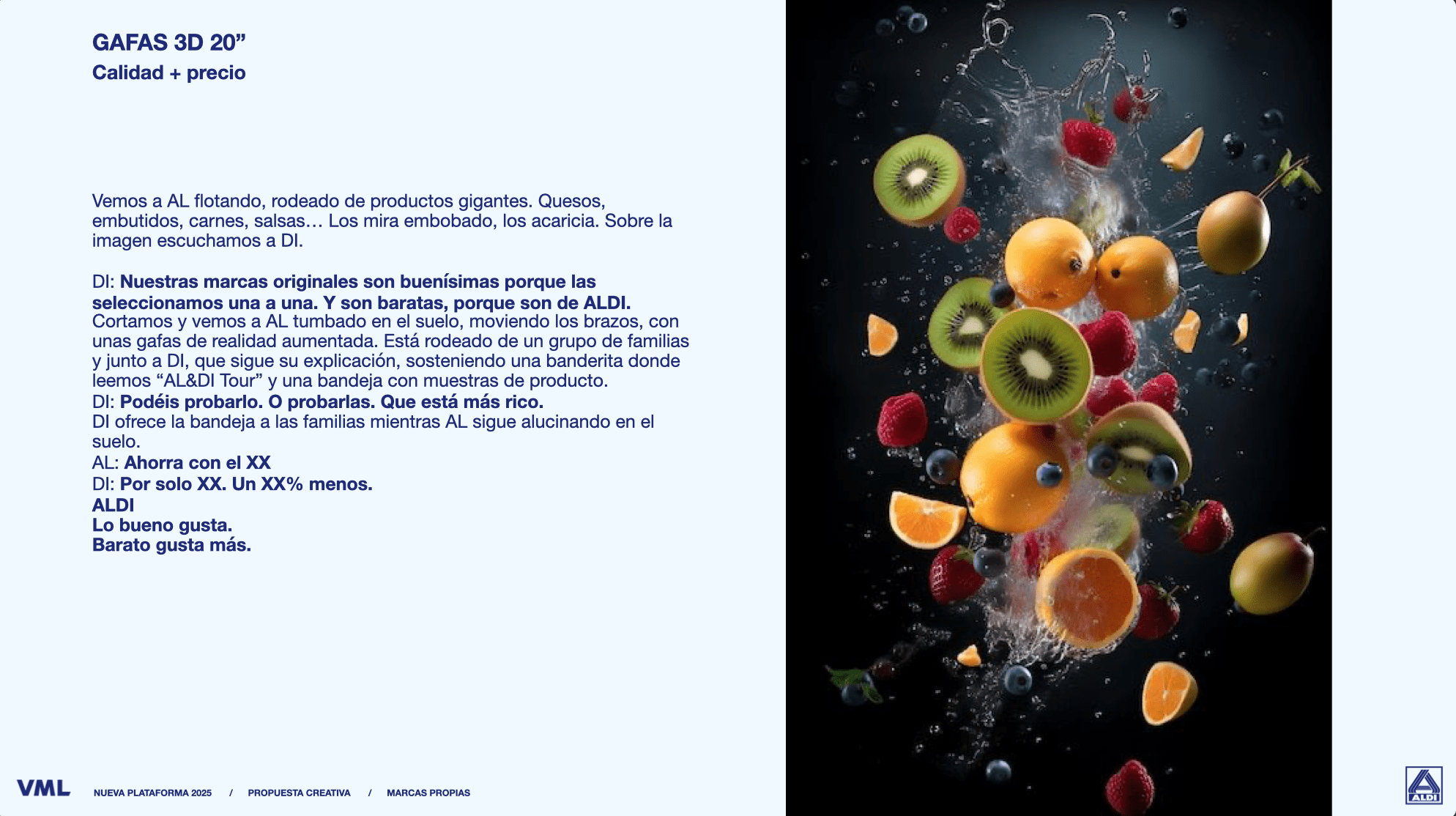Arrancamos con un plano espectacular: un plano general de ALDI flotando feliz por un limbo azul en el que flotan deliciosos alimentos gigantes,