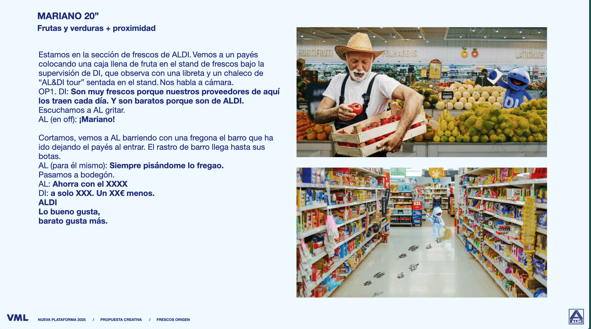En este guión nos centraremos en dos espacios icónicos del supermercado: en la zona de frutas y verduras, que es donde estarán DI y el payés, y en un pasillo que luce hermoso y abundante, con una fuga interesante, que es donde estará AL.