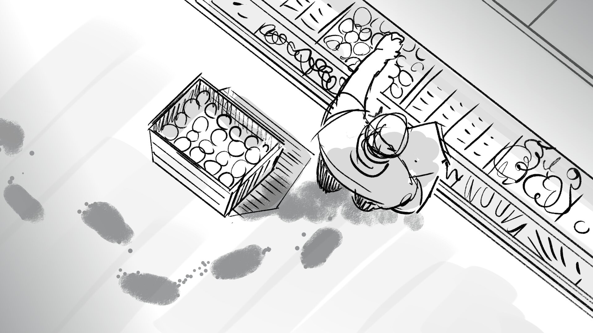 Arrancamos con un plano cenital de un payés colocando productos en la nevera de Frutas y Verdura + Proximidad.Es un trabajador auténtico, con el mismo aspecto que tiene cuando labora en el huerto. Nos fijamos en que ha dejado un reguero de huellas de barro en el suelo que revelan su recorrido.