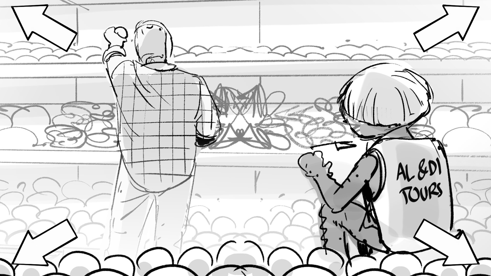 Con la cámara situada en uno de los pasillos en fuga, vemos cruzar por el horizonte a la comitiva de familias encabezadas por AL y DÍ. AL al frente con su banderín.