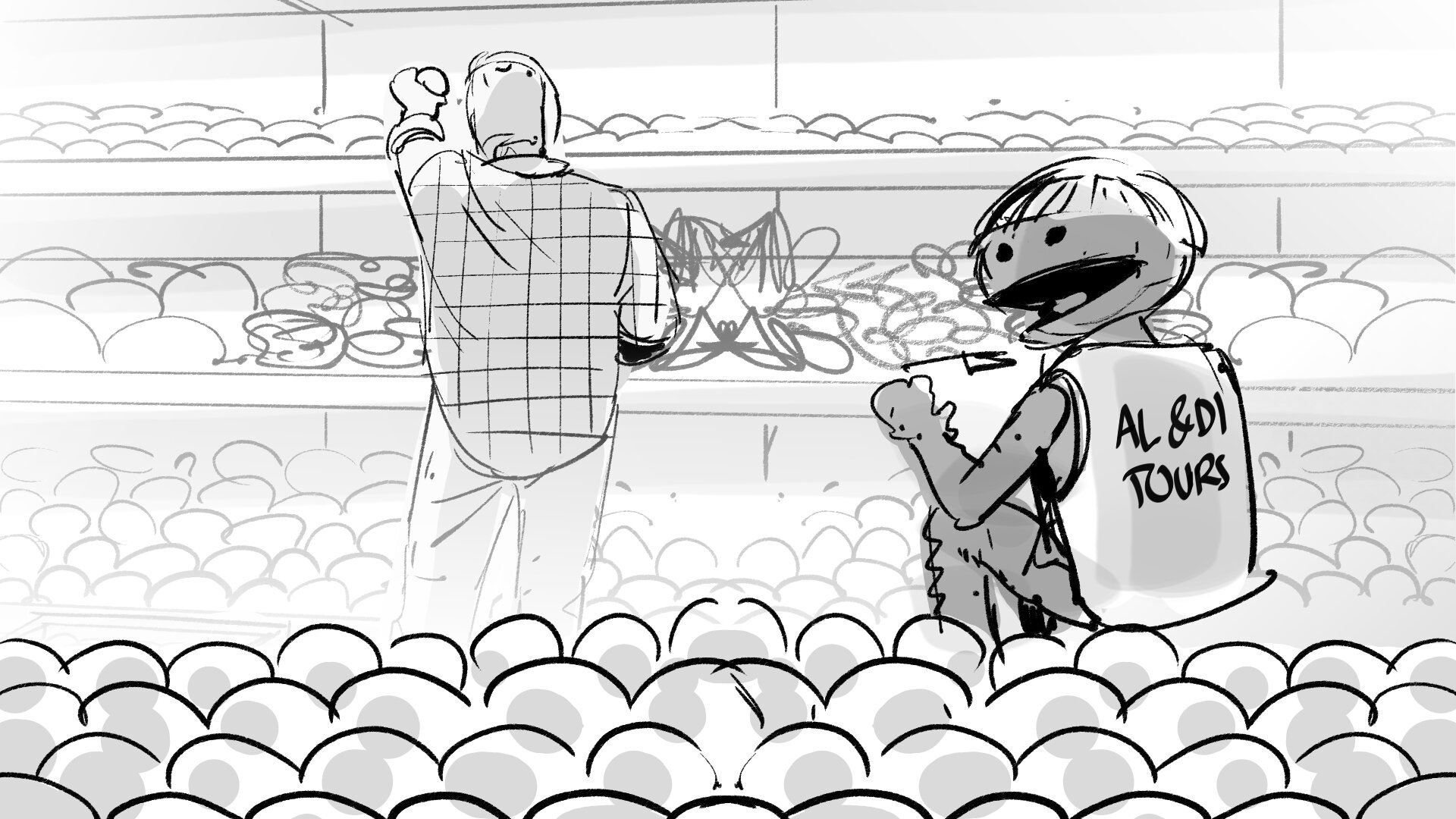 Una opción simpática puede ser ver a AL y a DI rodeados de vacas en una granja, con sus cabecitas sobresaliendo entre una multitud de vacas que pastan tranquilamente. Resulta que las vacas hacen muuuuucho ruido. Muchos MÚUUUUs, tantos que AL y DI no se pueden escuchar bien. Este problema auditivo puede dar pie al humor.