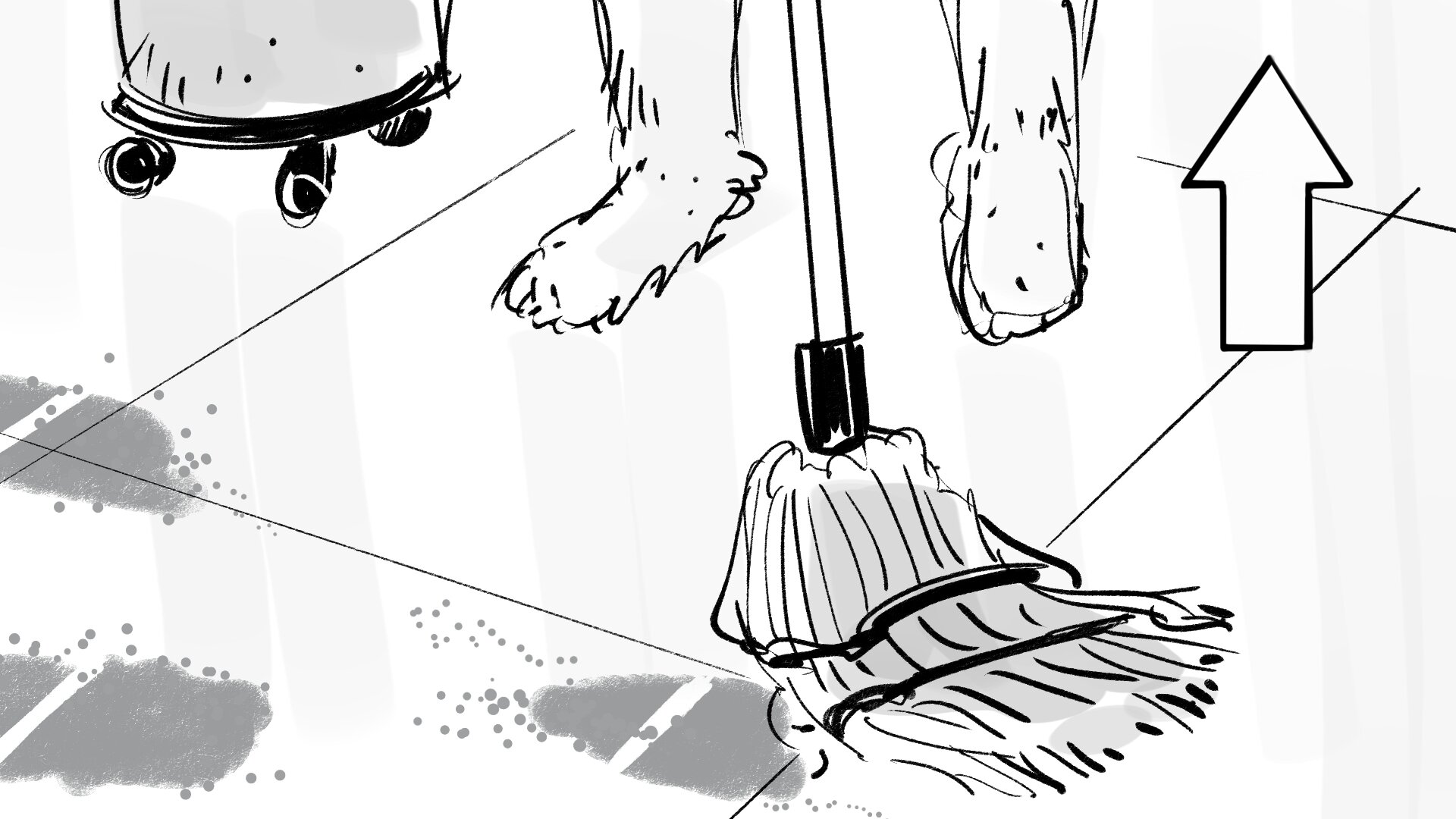 REF: Recurso de realización para descubrir a AL que friega las huellas de barro. Esta forma de mostrarlo nos favorece también a nivel muñecos, pues es un plano compuesto y nos permite rodar pies y cabeza por separado.