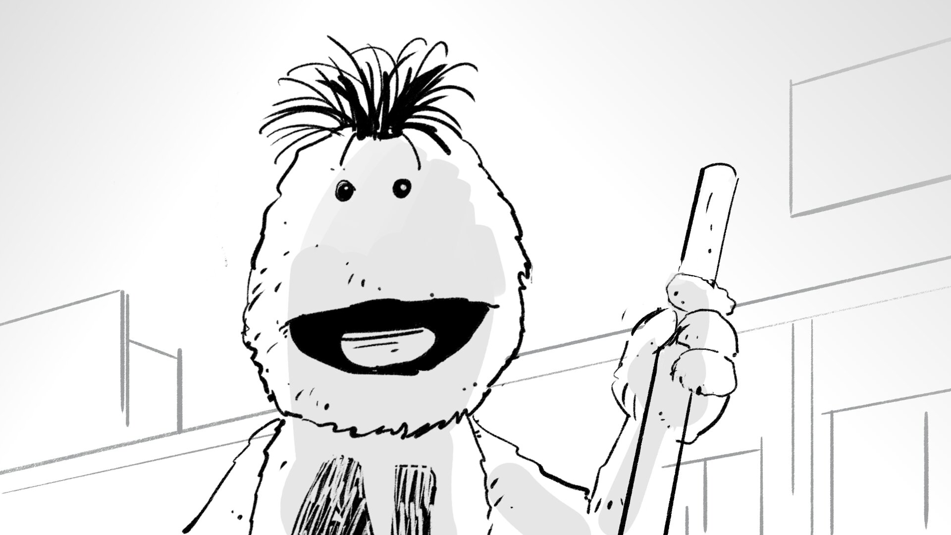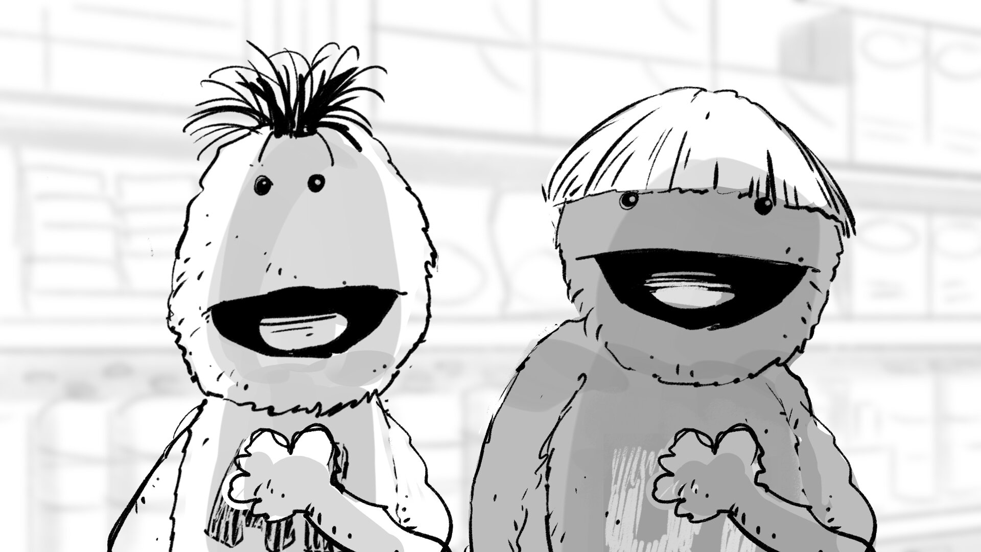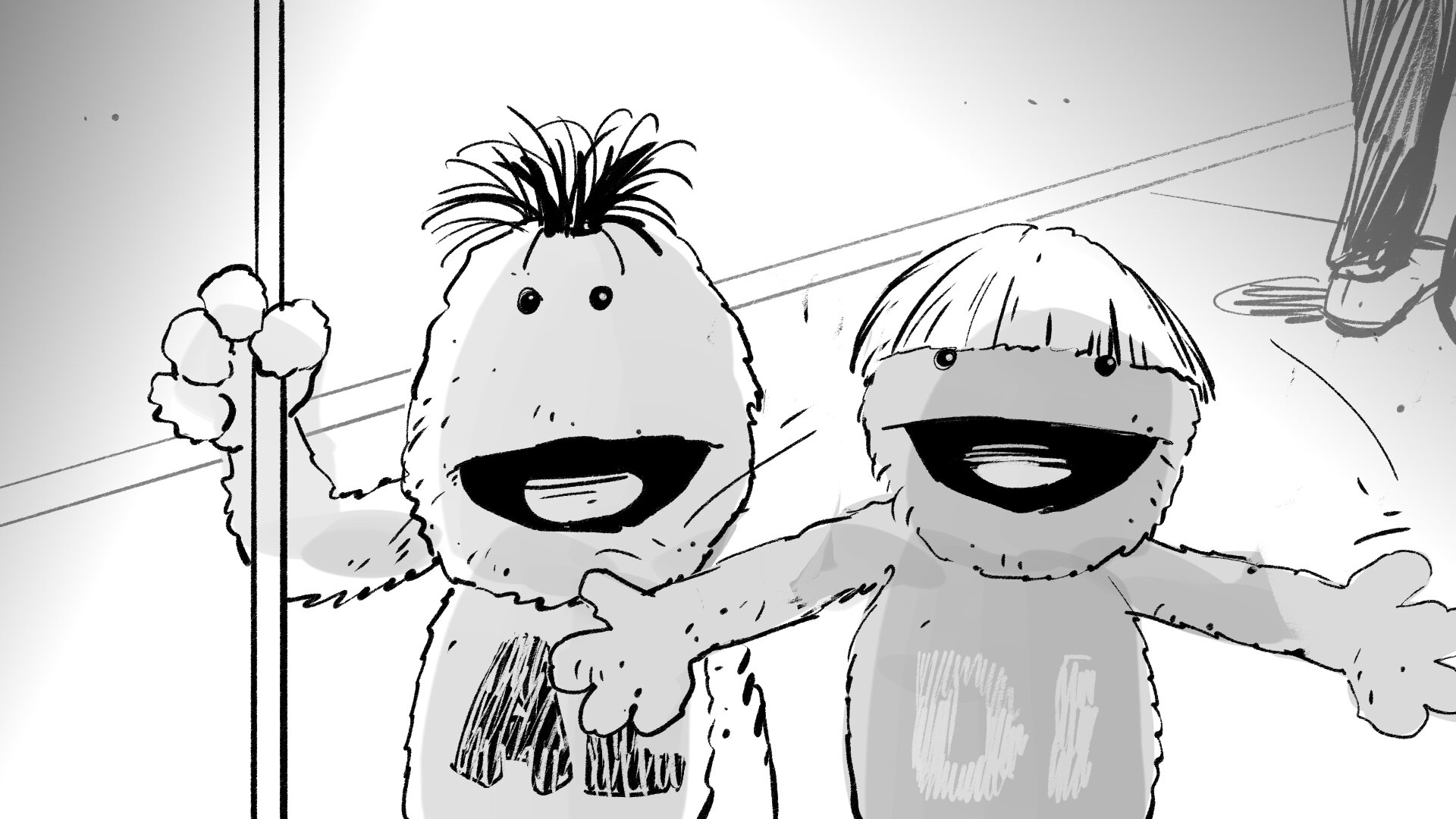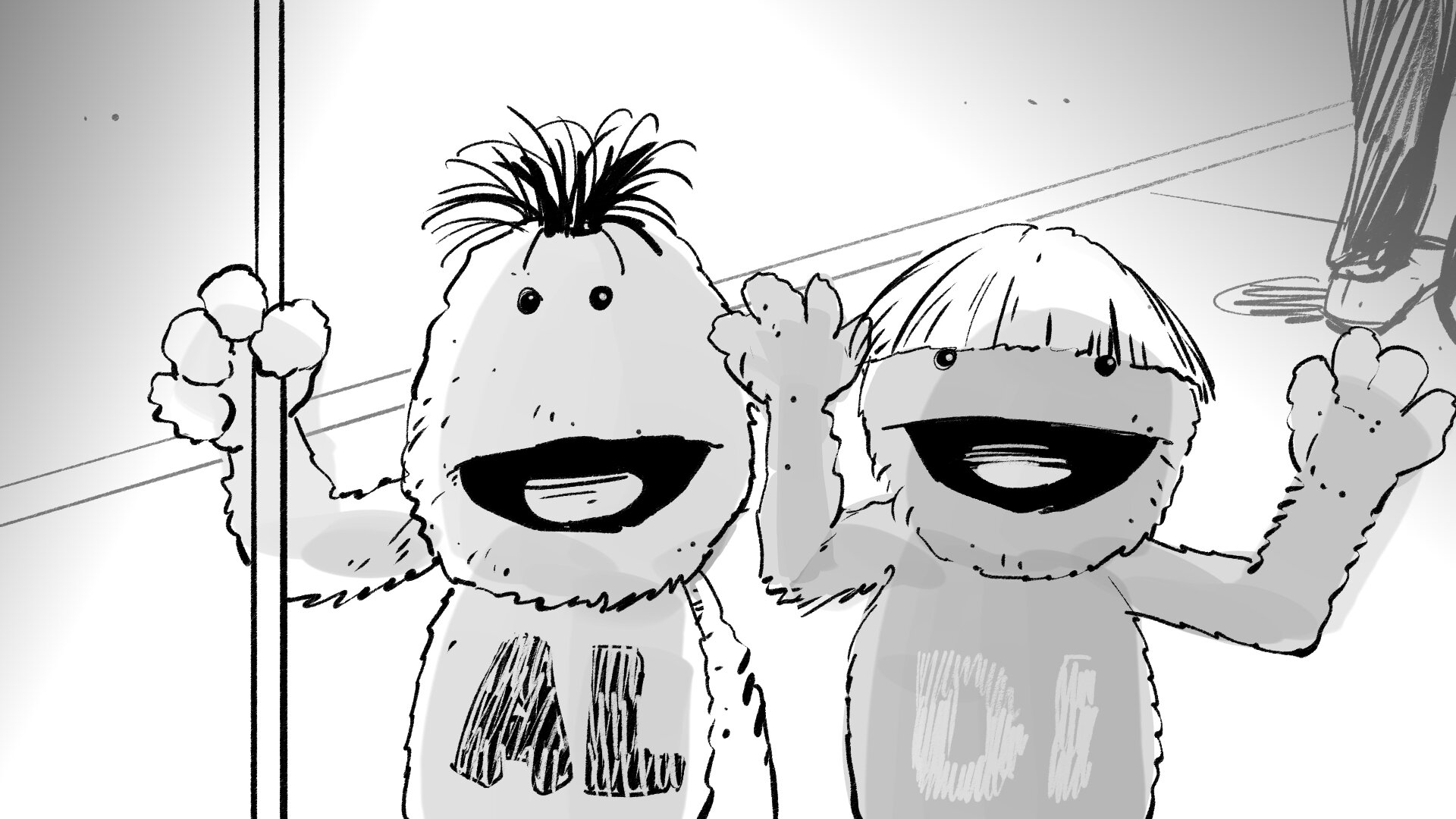 Molaría crear un choque de manos mítico entre la pareja de amiguis, una coreografía simpática. Haremos pruebas con los marionetistas previas a rodaje. Y si hay algo que nos gusta mucho a todos, lo podemos incorporar al repertorio.
