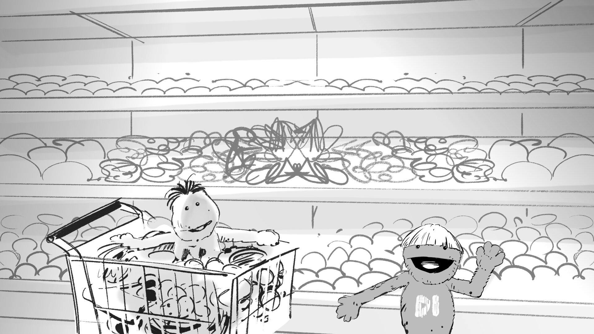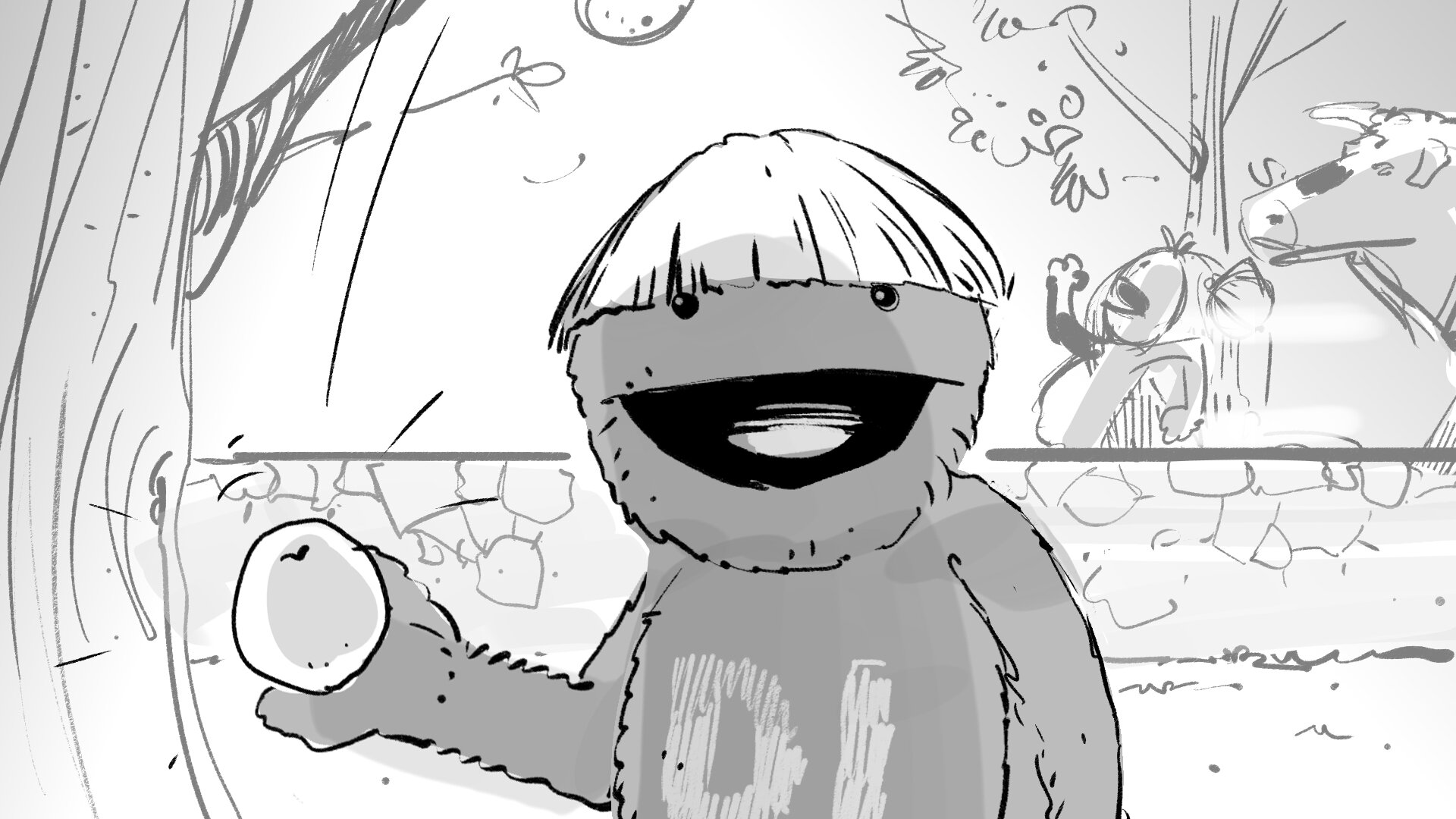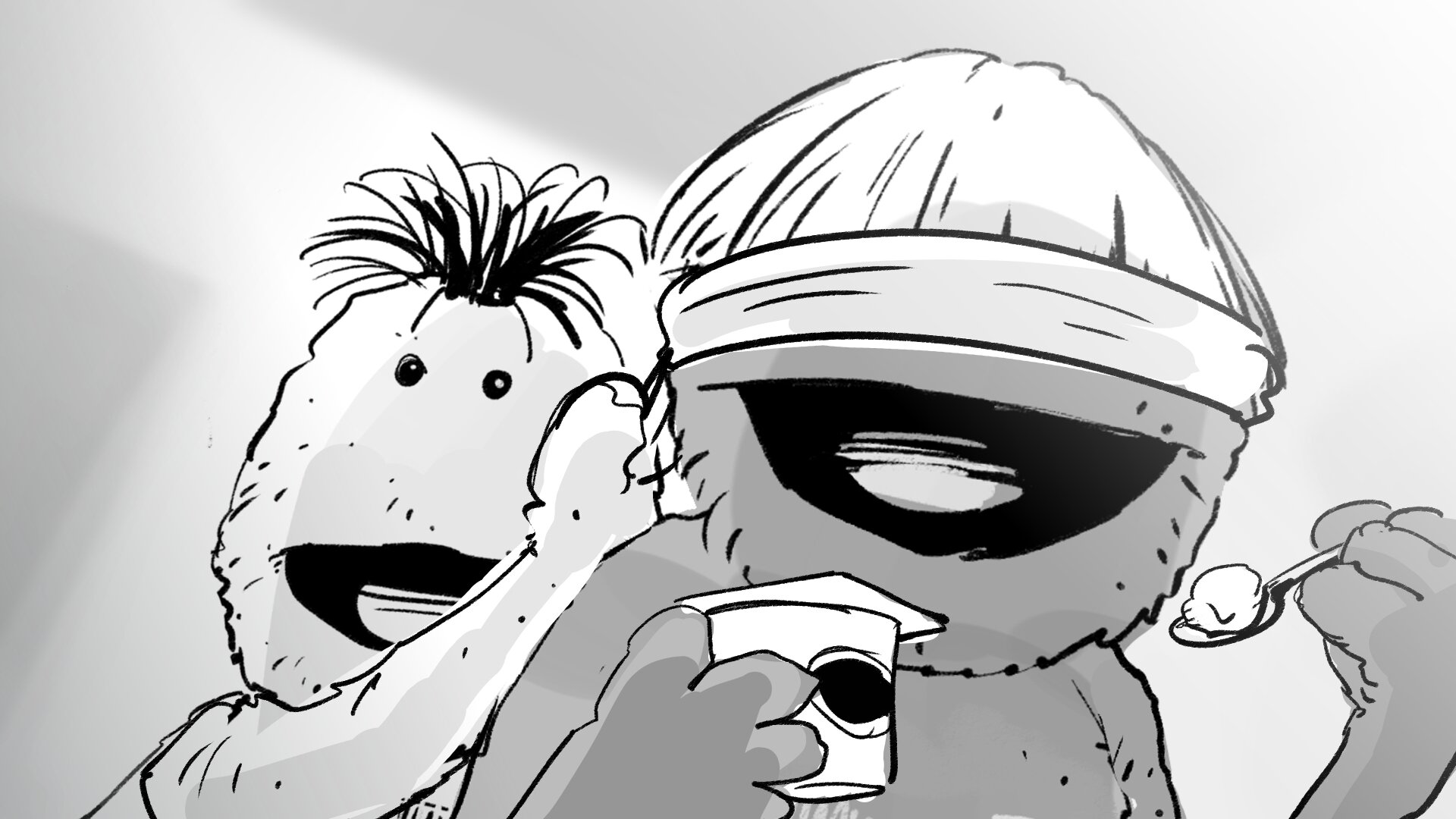 Molaría crear un choque de manos mítico entre la pareja de amiguis, una coreografía simpática. Haremos pruebas con los marionetistas previas a rodaje. Y si hay algo que nos gusta mucho a todos, lo podemos incorporar al repertorio.