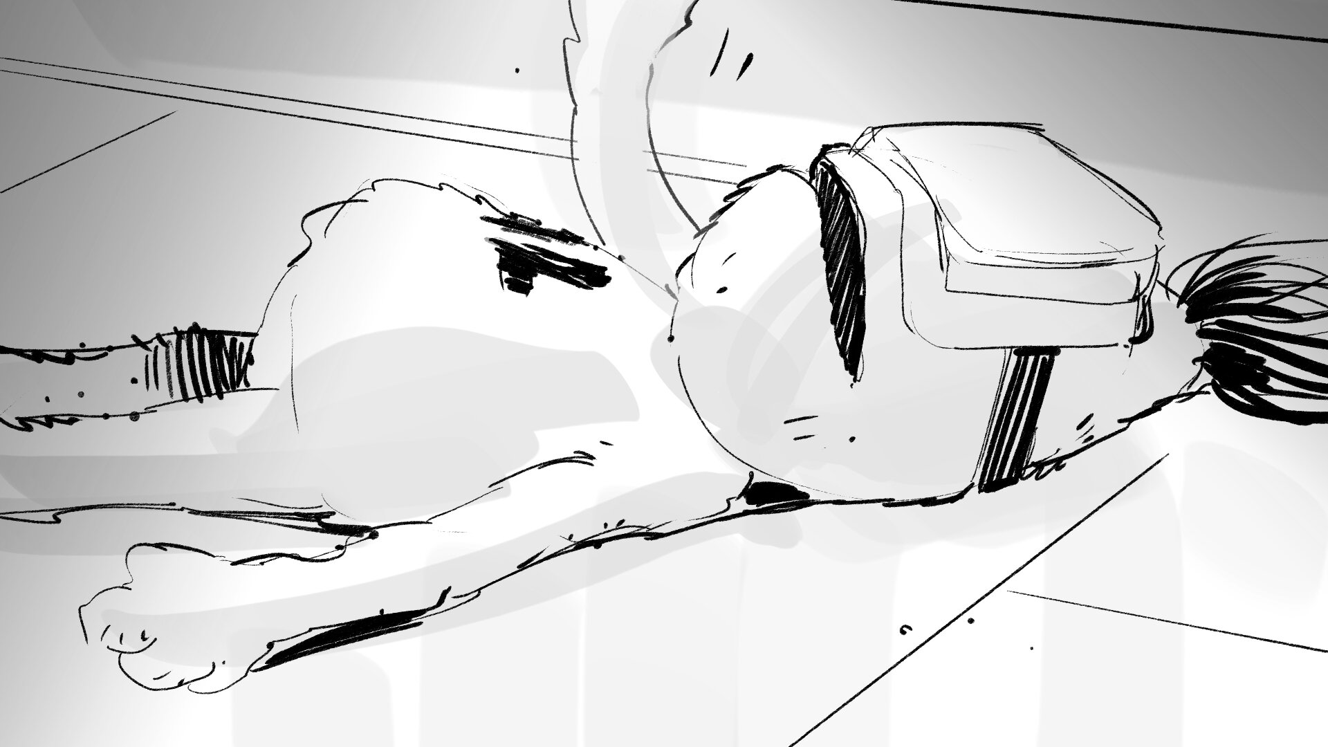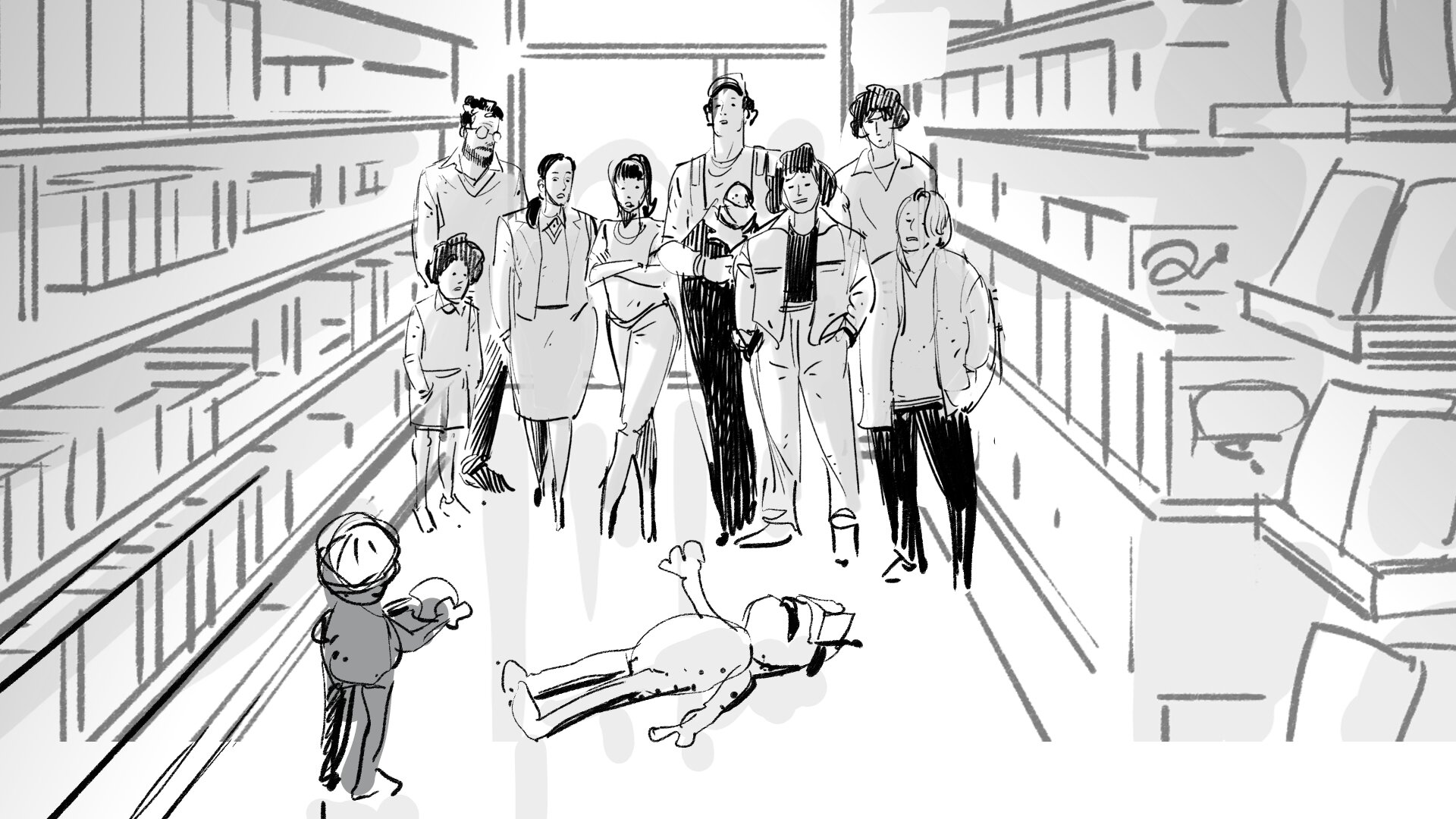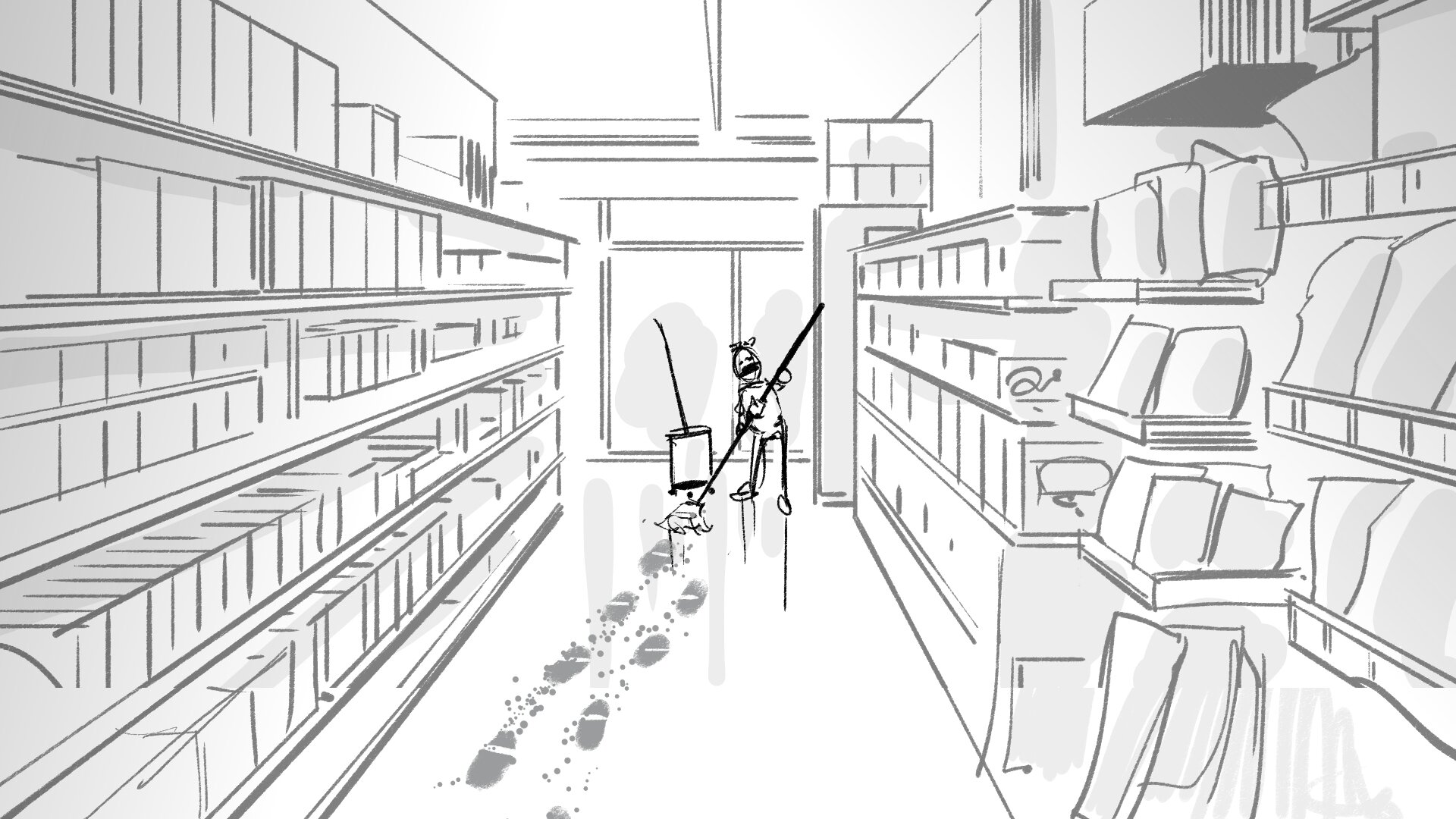 Cortamos a un plano general del pasillo, y vemos que las huellas recorren todo el pasillo hasta salir de cuadro. Este plano necesitaremos irremediablemente rodarlo con bunraku.