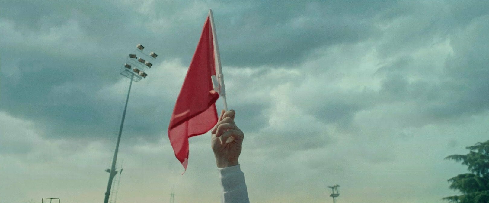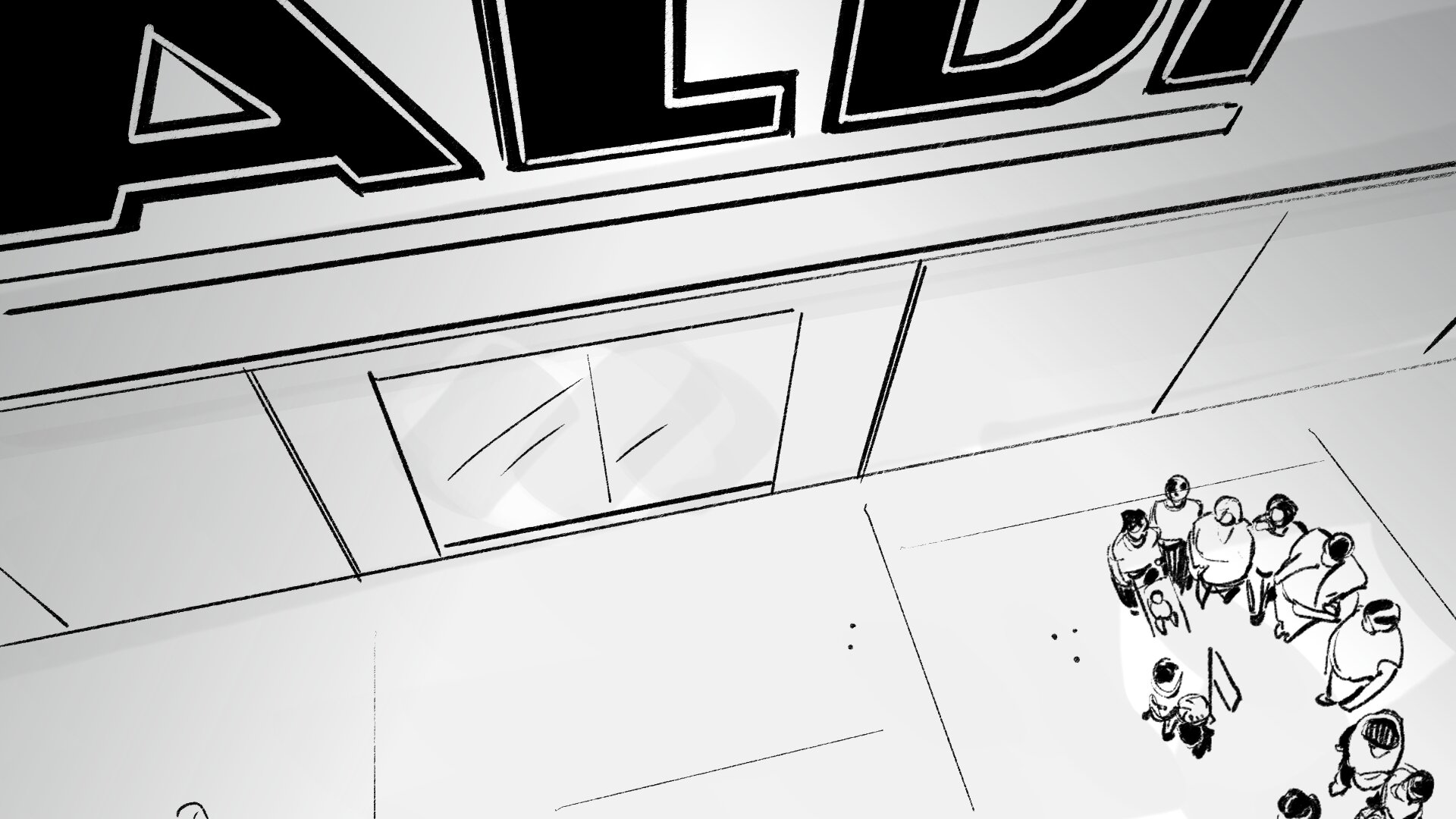 El spot arranca con un plano de situación que respira cine, una vista aérea de un ALDI a pie de calle, y en la acera un pequeño grupo reunido entorno a una banderola roja.