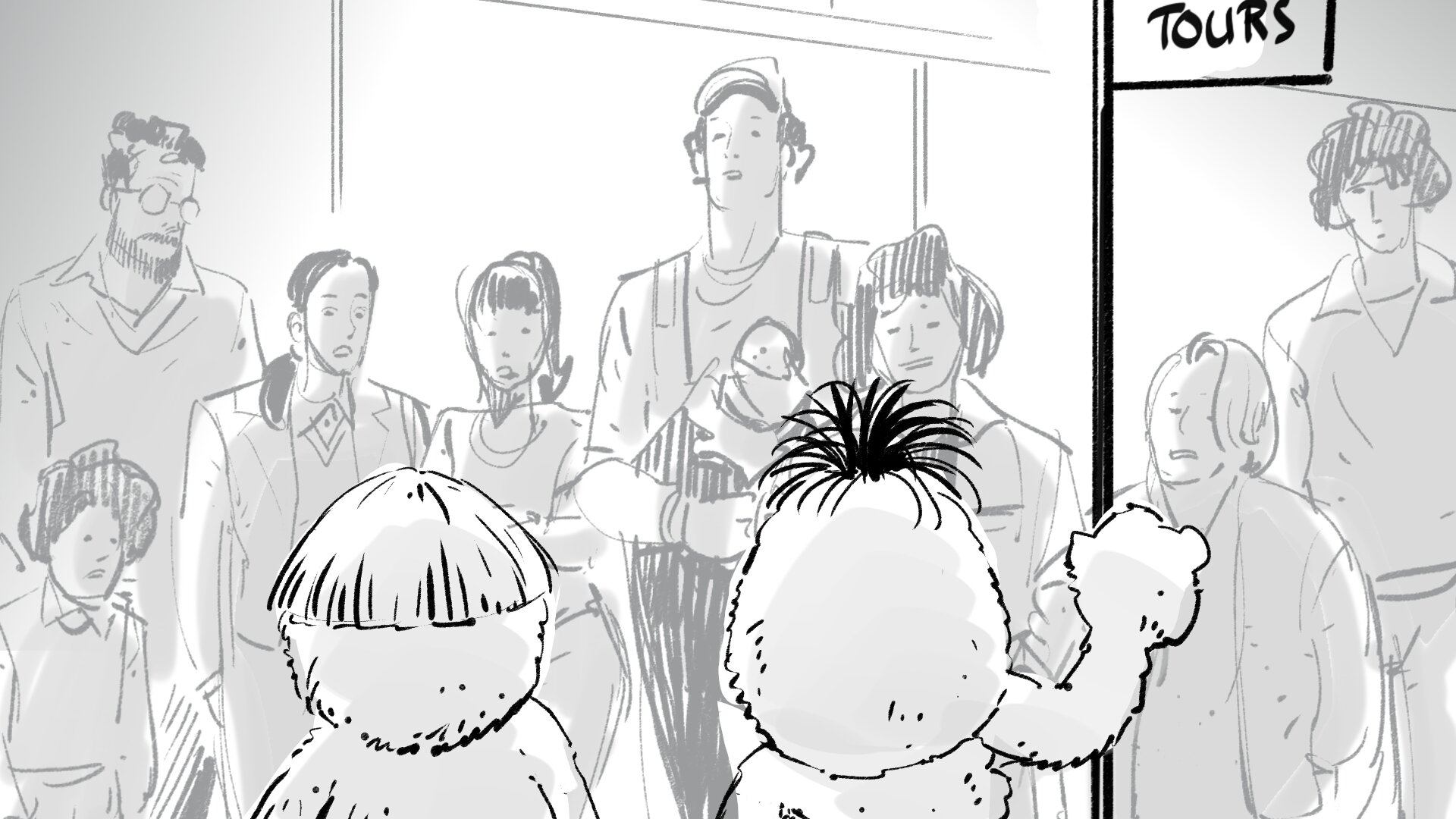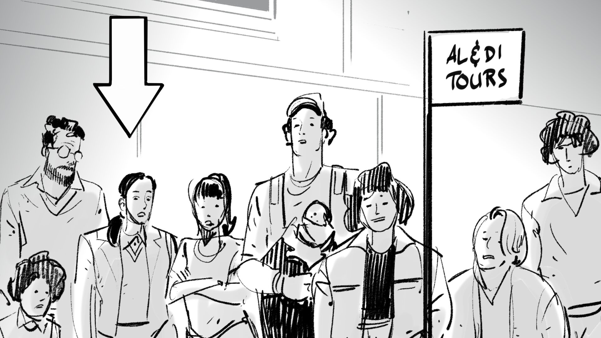 Corte a un plano conjunto de tres familias en plano medio. Todos miran con extrañeza a alguien pequeñito que tienen delante. Entre las familias asoma una banderita roja típica de guía, en la que podemos leer AL&DI TOUR, pero que no sabemos de dónde sale.