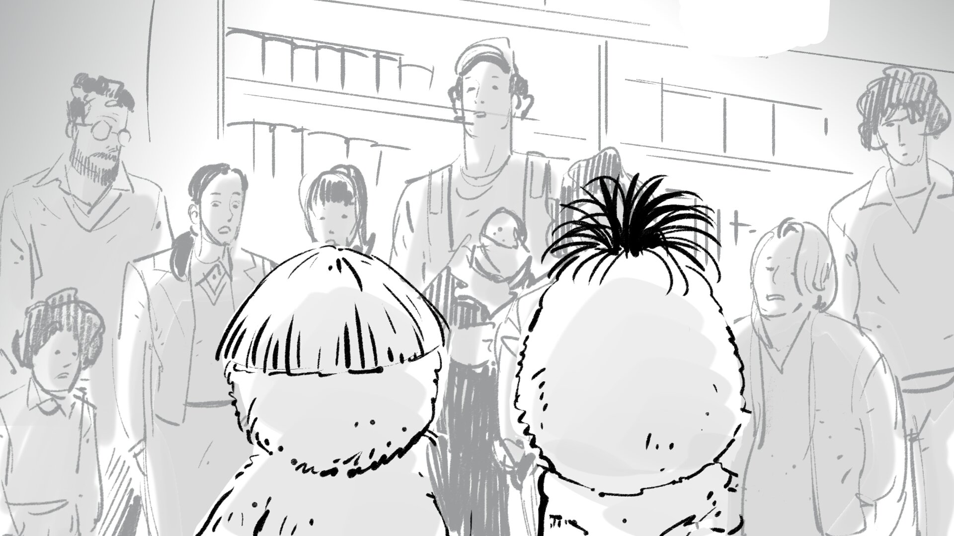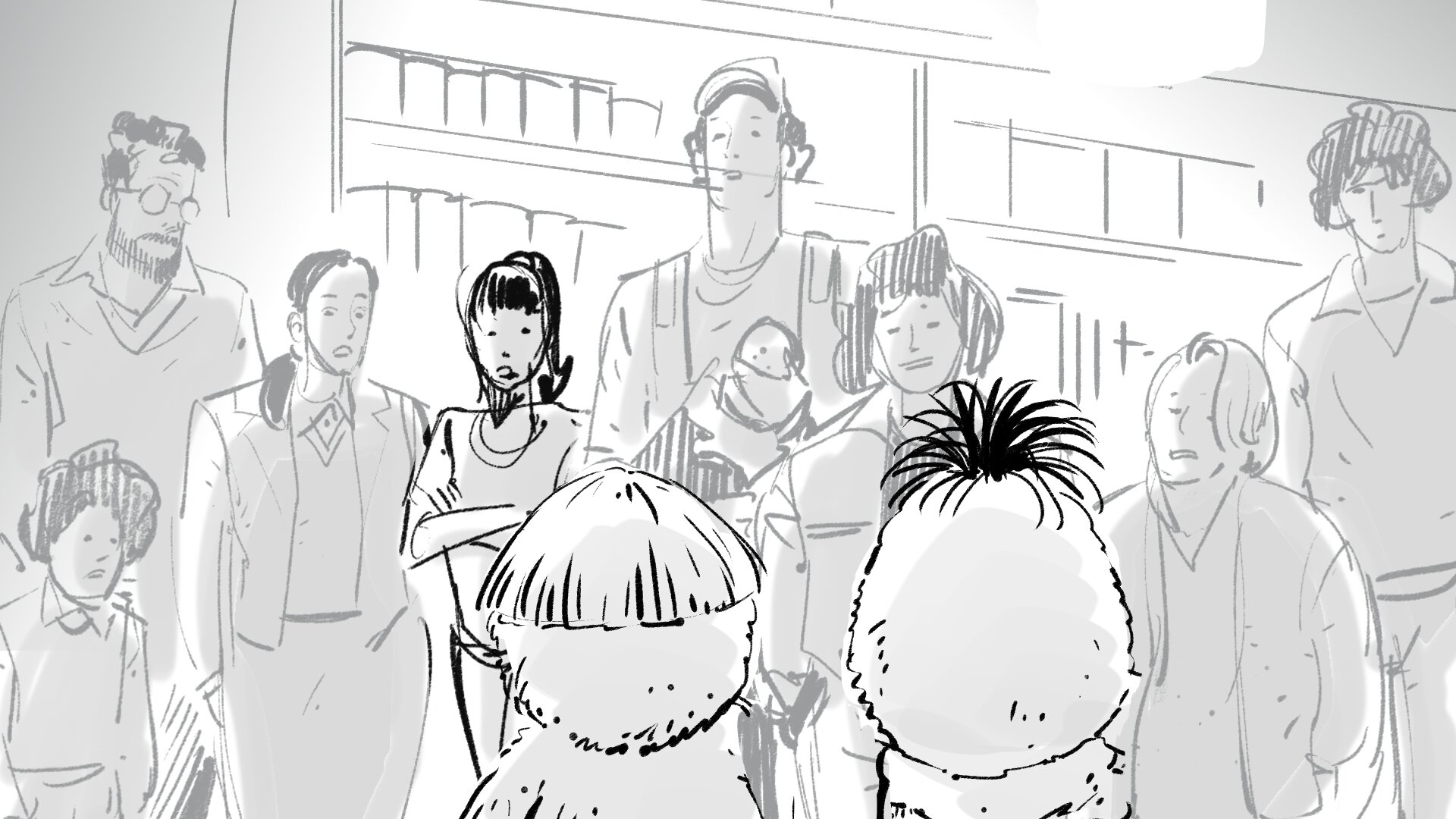 Volvemos al plano trasero de AL y DI, con el foco en la cara de la gente, que reacciona satisfecha a las palabras de DI.