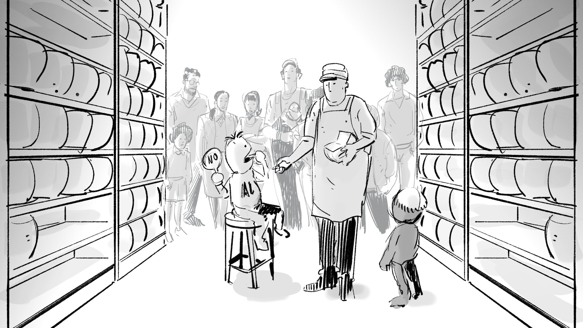 Abrimos plano y vemos que estamos en la sala de de catas, donde AL está dando a probar queso a las familias.