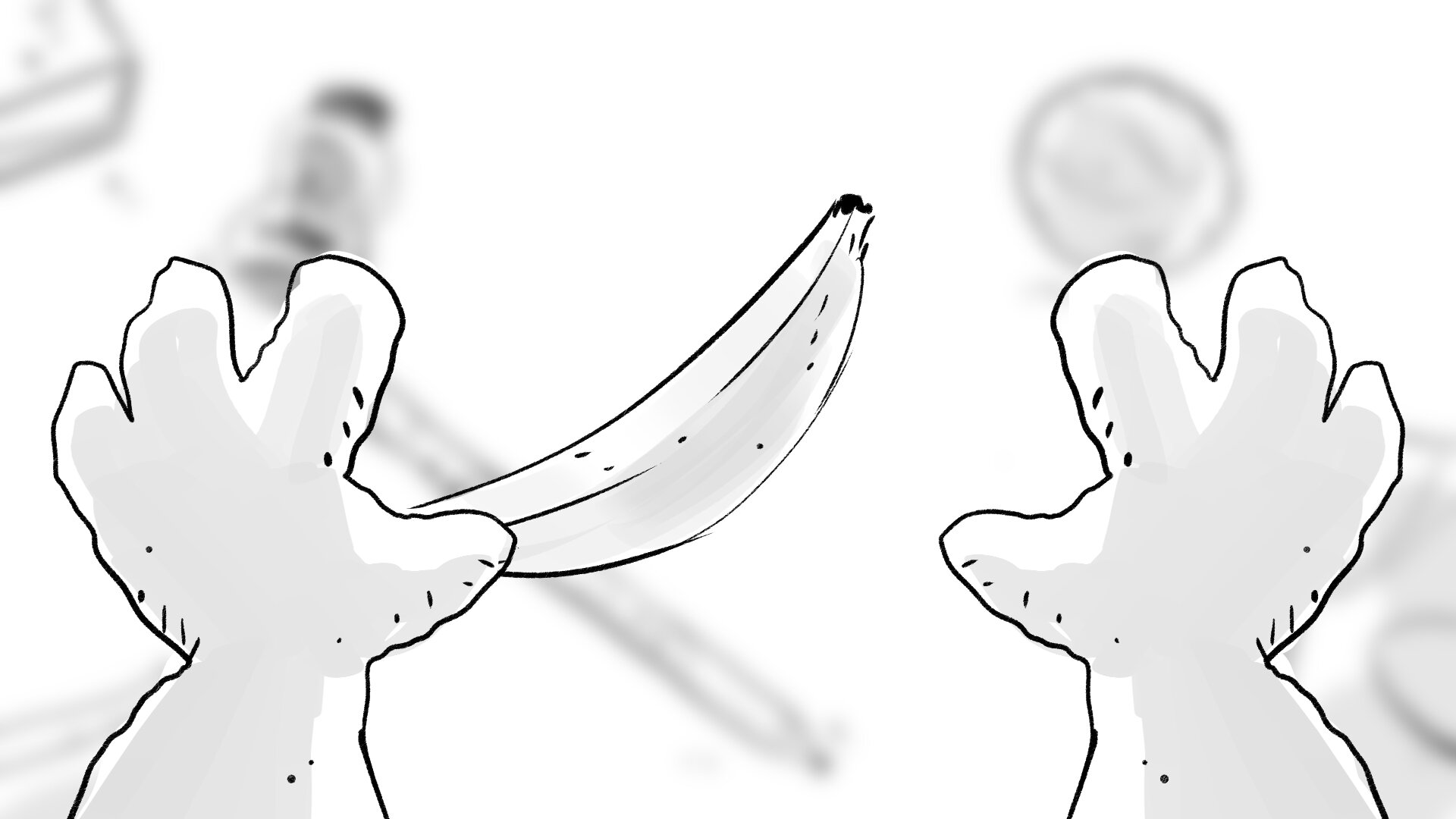 Pasamos a un punto de vista subjetivo de AL y vemos que delante suyo tiene flotando un plátano gigante. Extiende las manos para poder tocarlo, se acerca a él, casi lo puede rozar...