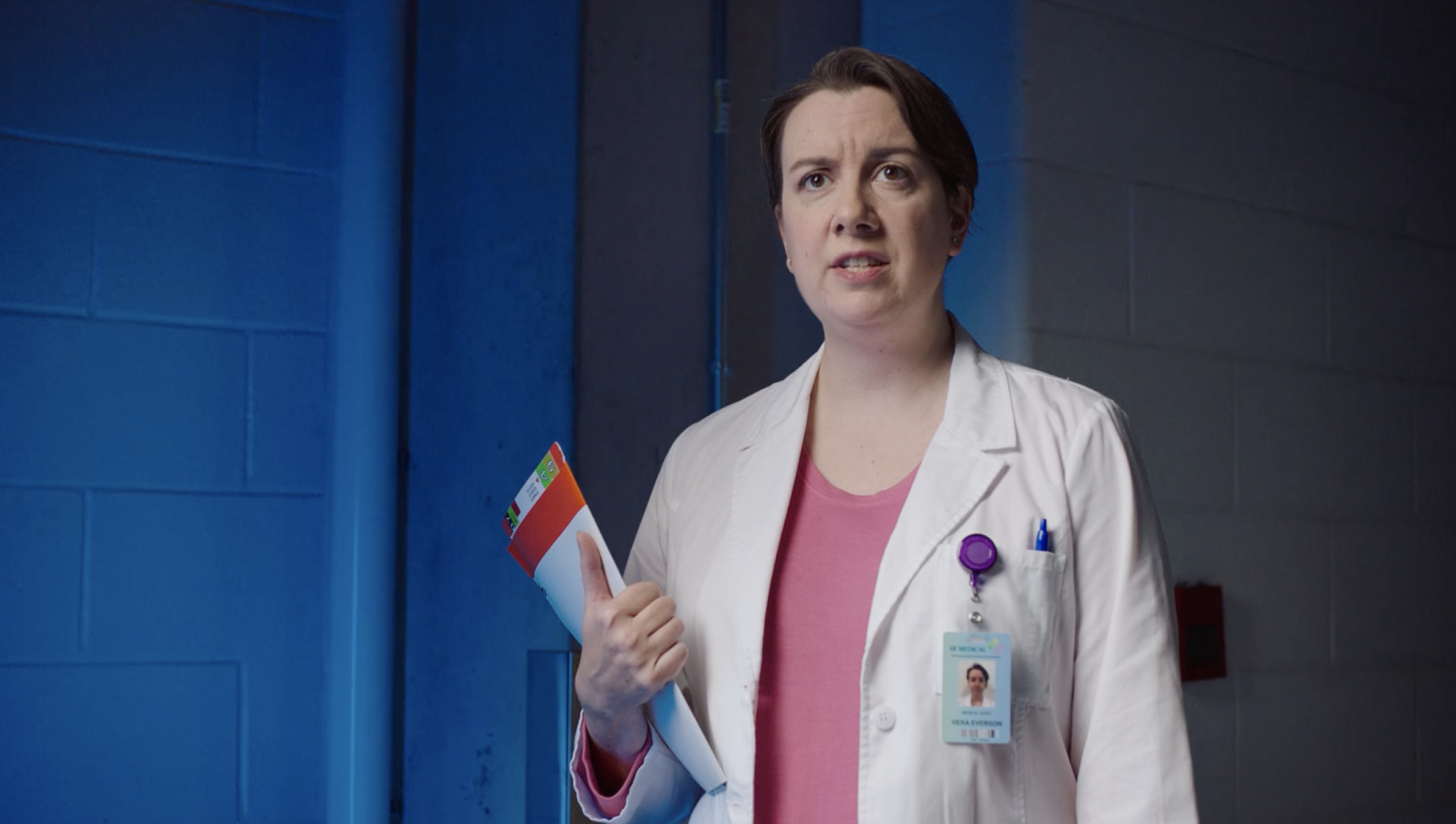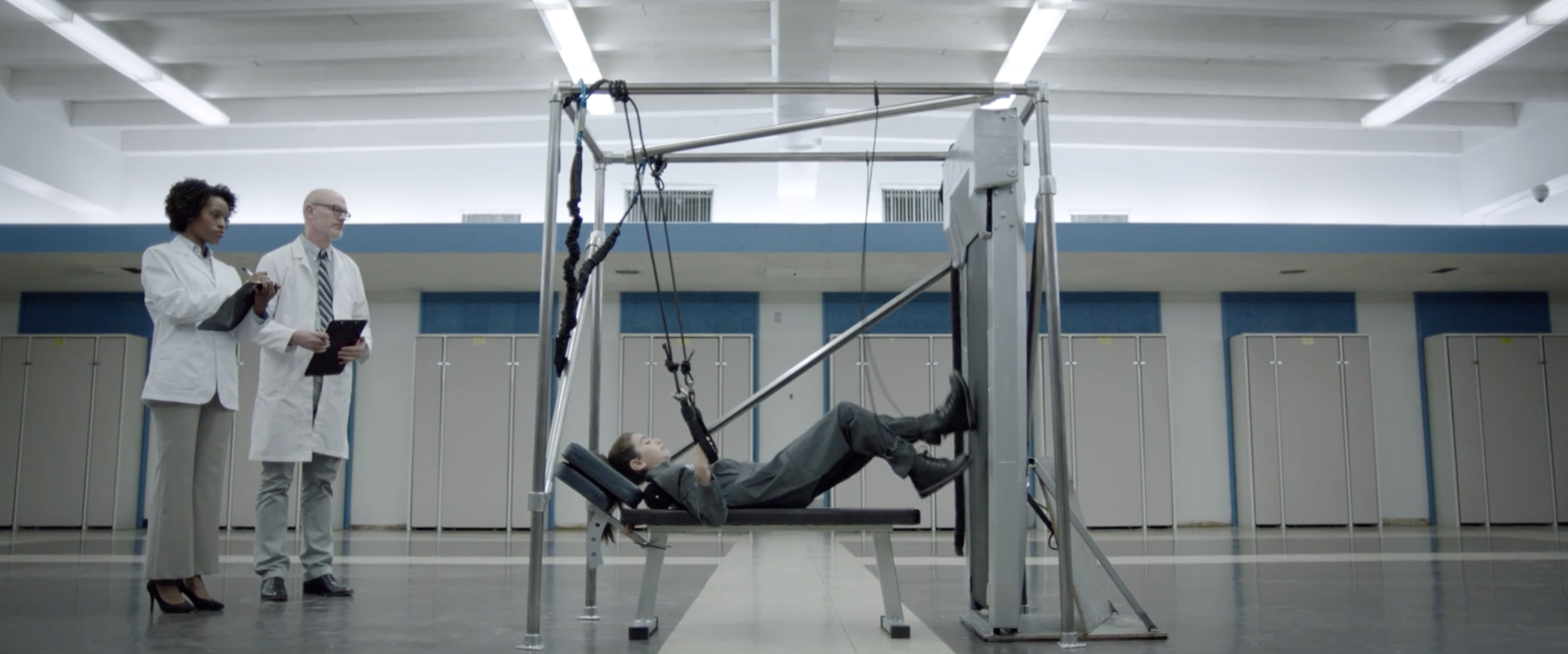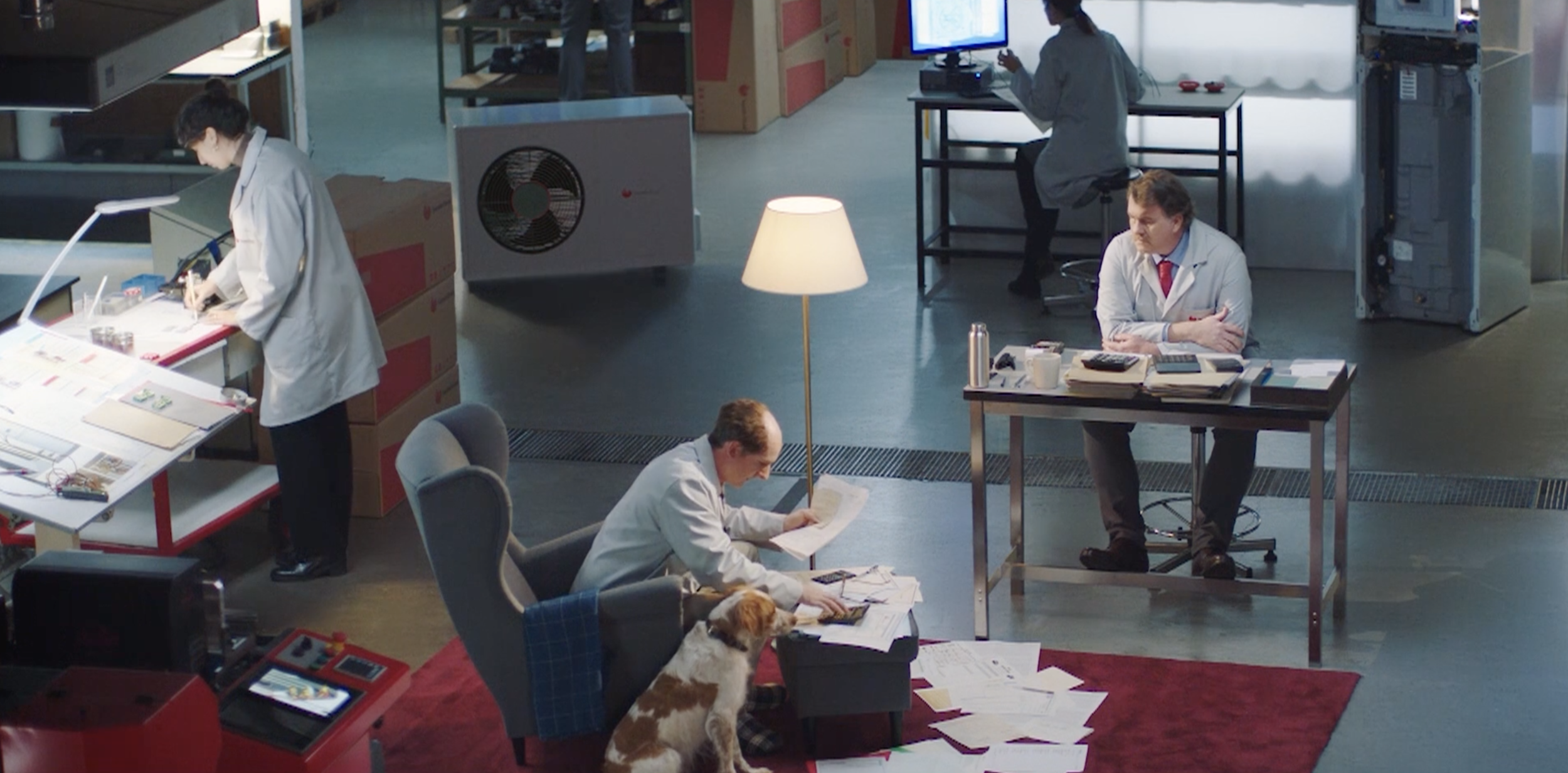 Dos trabajadores, un hombre y una mujer, ella de trentaitantos, el más de cincuenta, con bata de laboratorio, serios, rigurosos, profesionales, muy observadores. Personajes reales. Toman nota de las reacciones y observaciones de AL.