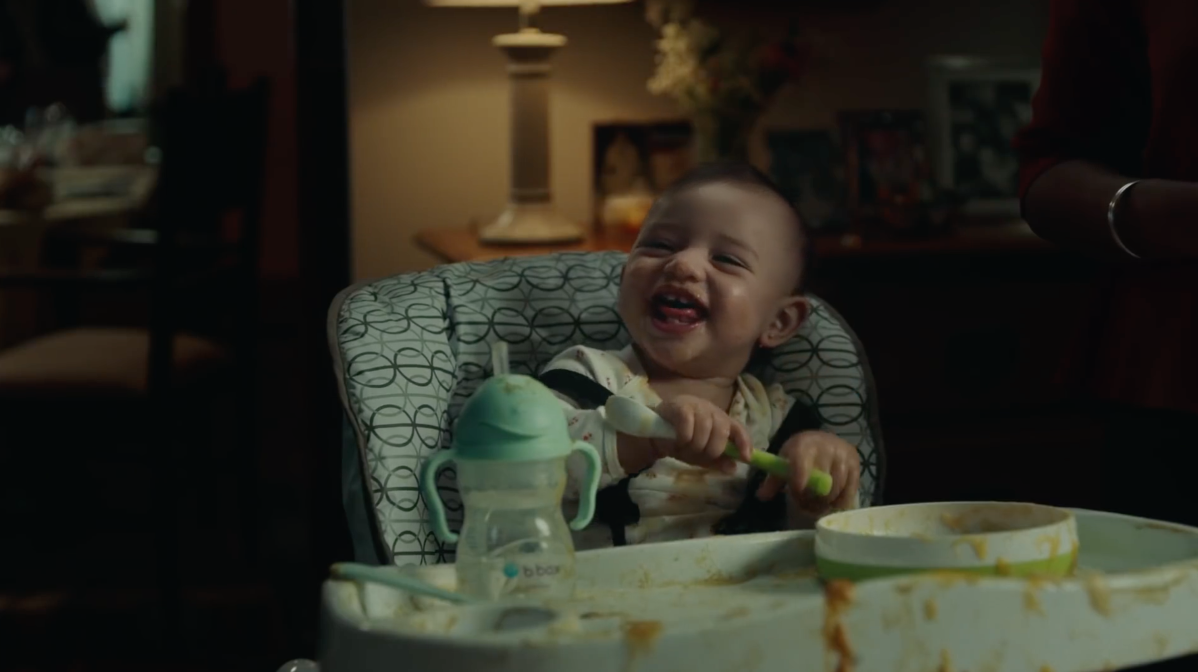 Cortamos a un plano mega encantador de un bebé manchado de frutos rojos. Sonrie por la presencia de nuestrpos protagonistas, en fuera de cuadro.