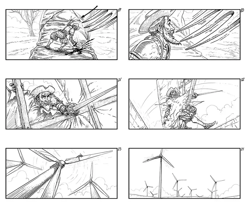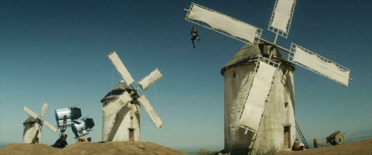Don Quijote avanza y entra una molino en cuadro. Plano angular.