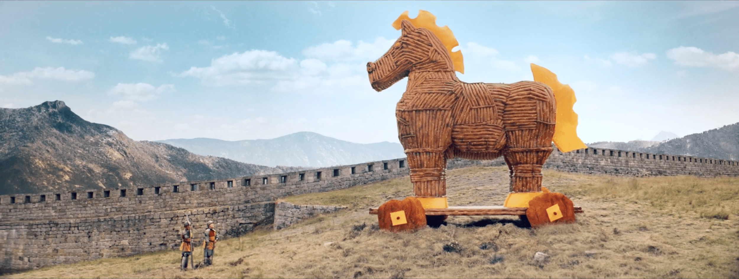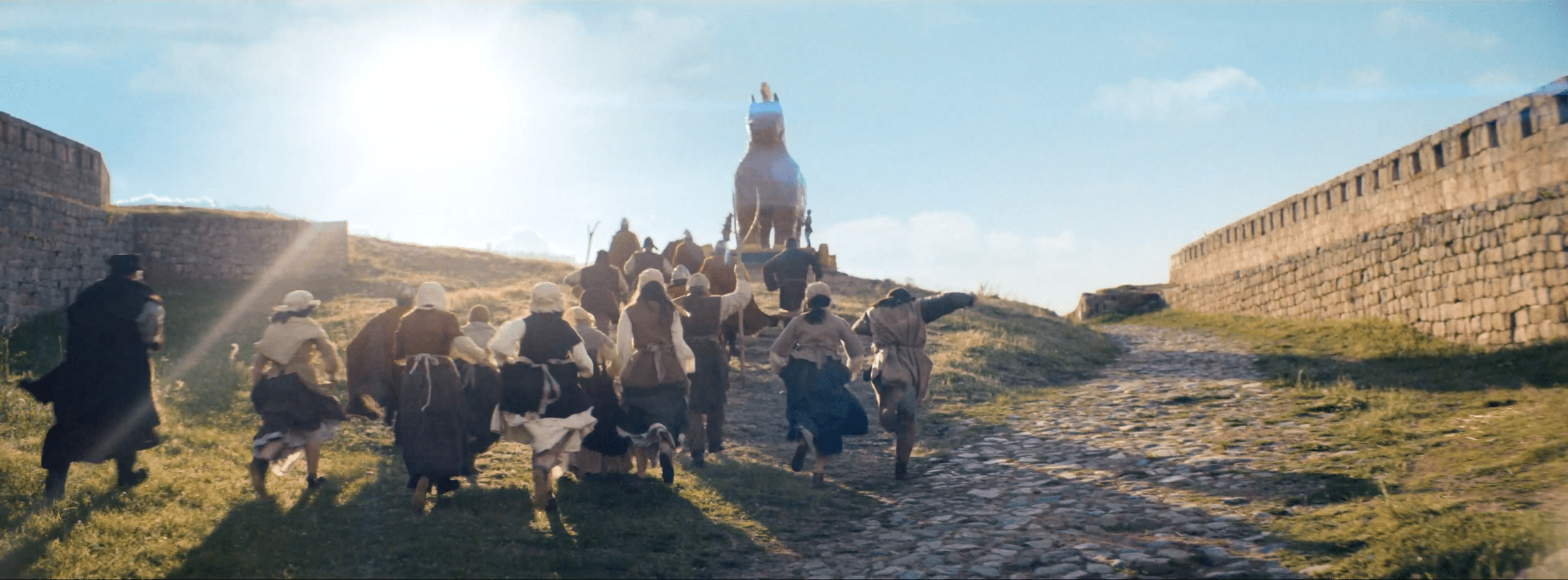 Estamos en un exterior en las proximidades de una muralla o construcción real interesante. Esa muralla la vemos a lo lejos detrás de los personajes.