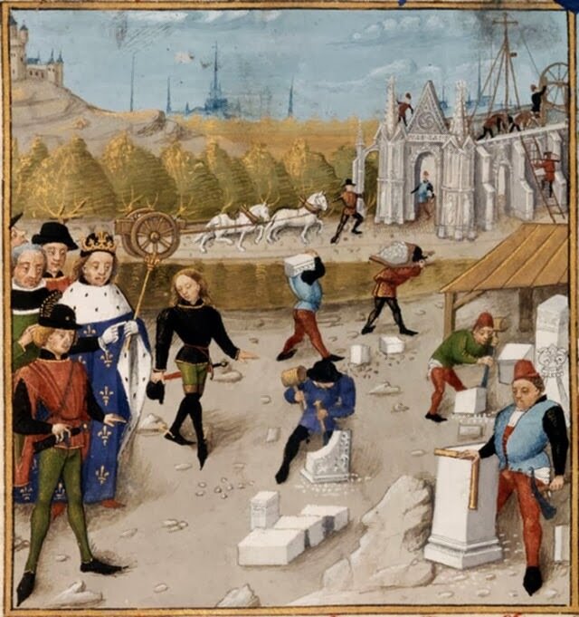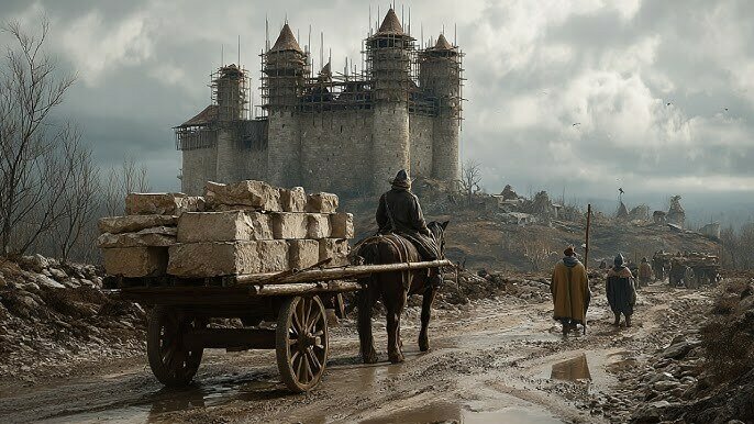 Un carro con material de construcción tirado por un burro cruza por delante de cámara y detrás suyo descubrimos a una pareja de albañiles (o albañil y arquitecto) del siglo XII. Uno (el arquitecto) mira algo que hay delante con los ojos entornados y una sonrisa de satisfacción, mientras que el otro, el albañil, mira al mismo punto con gesto de extrañeza.