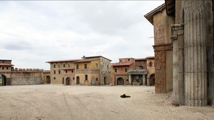 Tras la torre, en el horizonte, podremos ver unas edificaciones bajas medievales. Se tratará de un matepainting realista que integraremos en postproducción. El único elemento de este plano que tenemos que rodar es el suelo de tierra, una extensión lo suficientemente grande, de unos 40 metros de ancho, para que postproducción pueda trabajar sobre él.