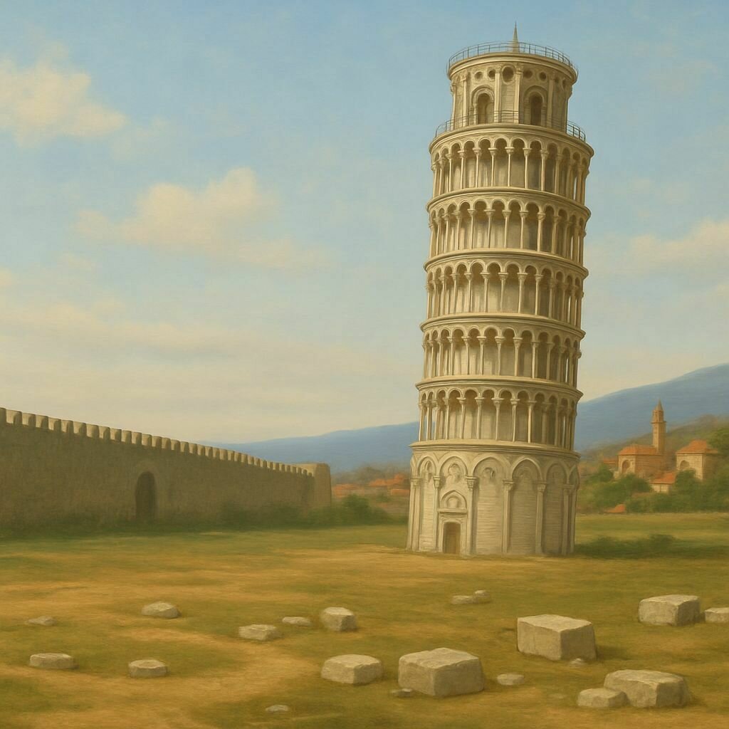 El plano cobra foco. Plano icónico De la Torre de Pisa. Está recién terminada de construir. Detrás suyo se distingue una montaña y la ciudad de Pisa difuminada. No hay ninguna otra gran construcción robándole protagonismo a la torre.
