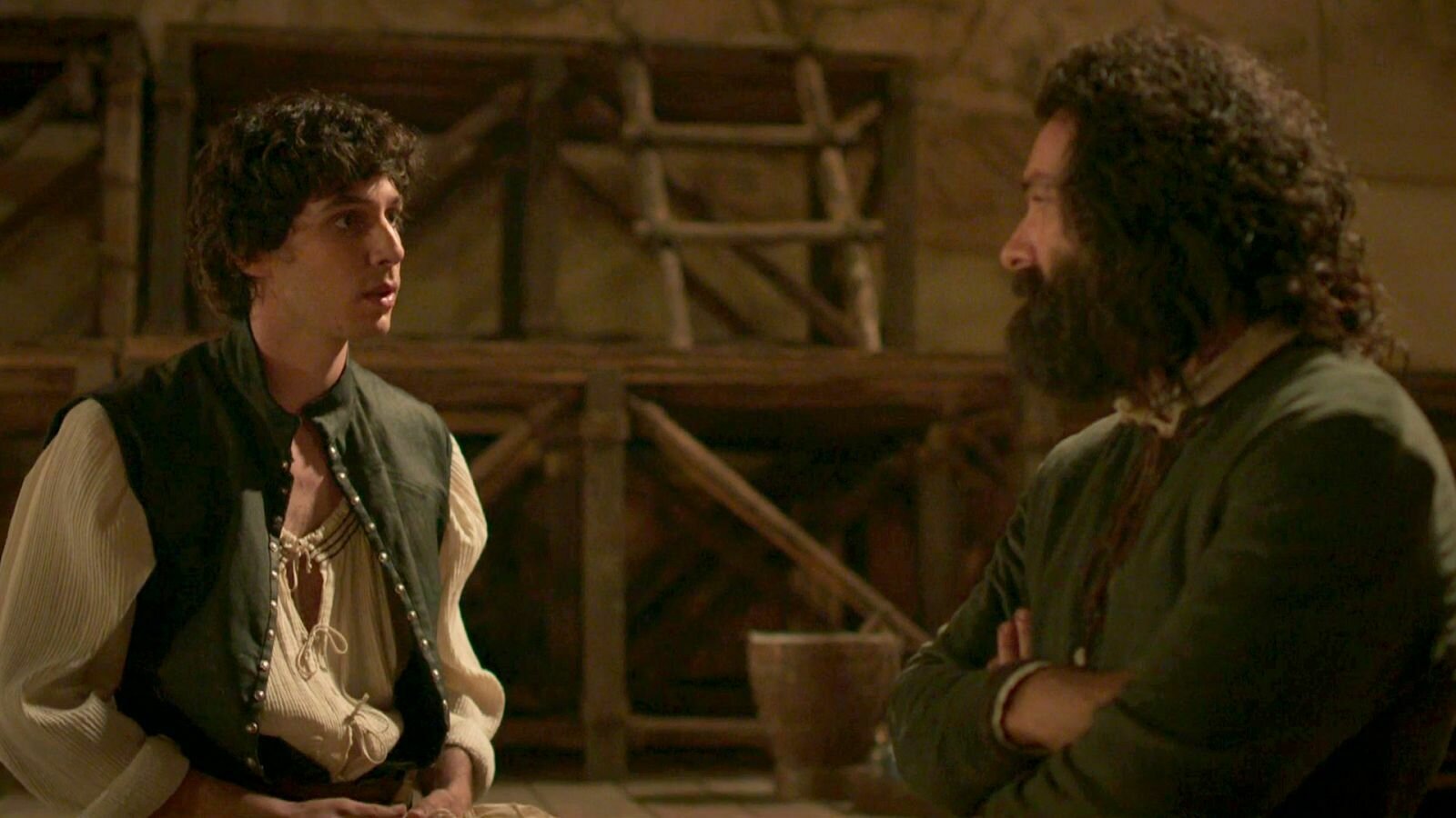 En el plano de los dos protagonistas, repartidos por el espacio, habrá una serie de elementos que ambientarán la localización para que parezca una auténtica zona de obras medieval. Así, veremos un burro tirando de un carro con carga de la construcción, grandes bloques de piedra, algunos están siendo tallados, hay una escalera, cestos, herramientas...