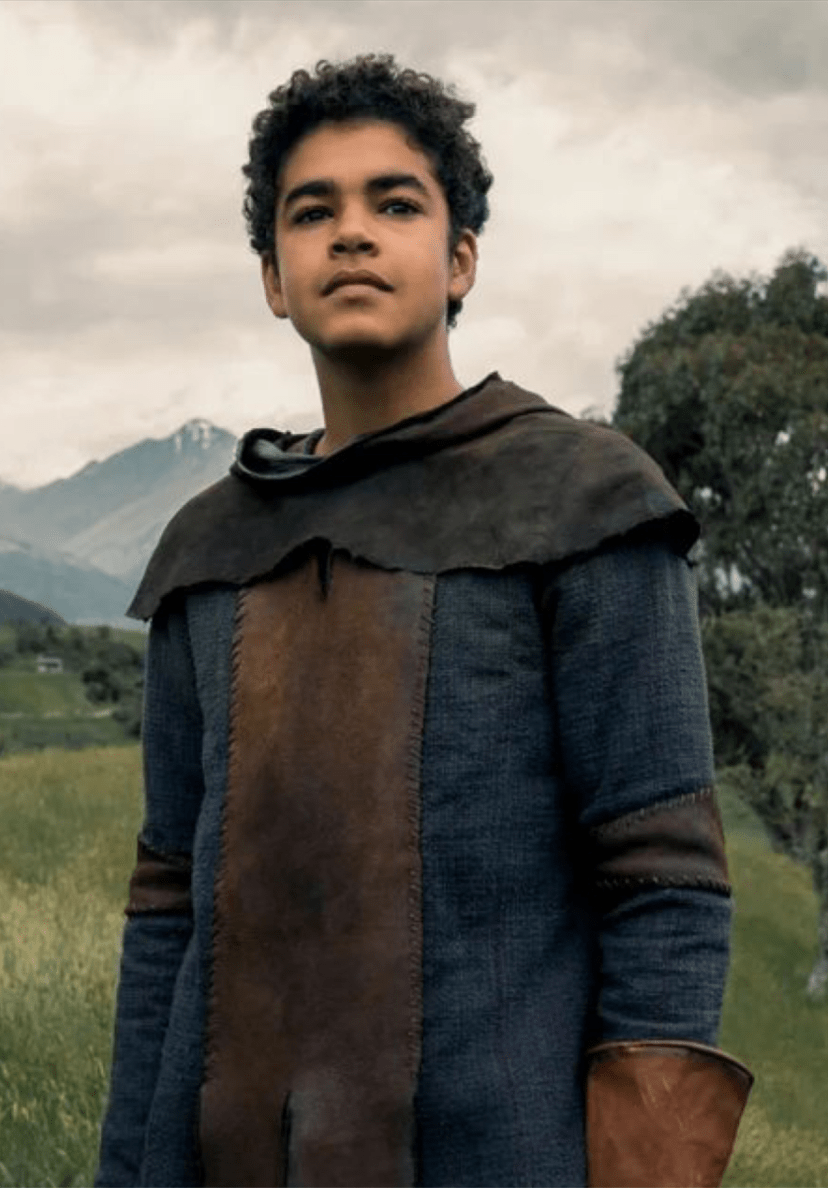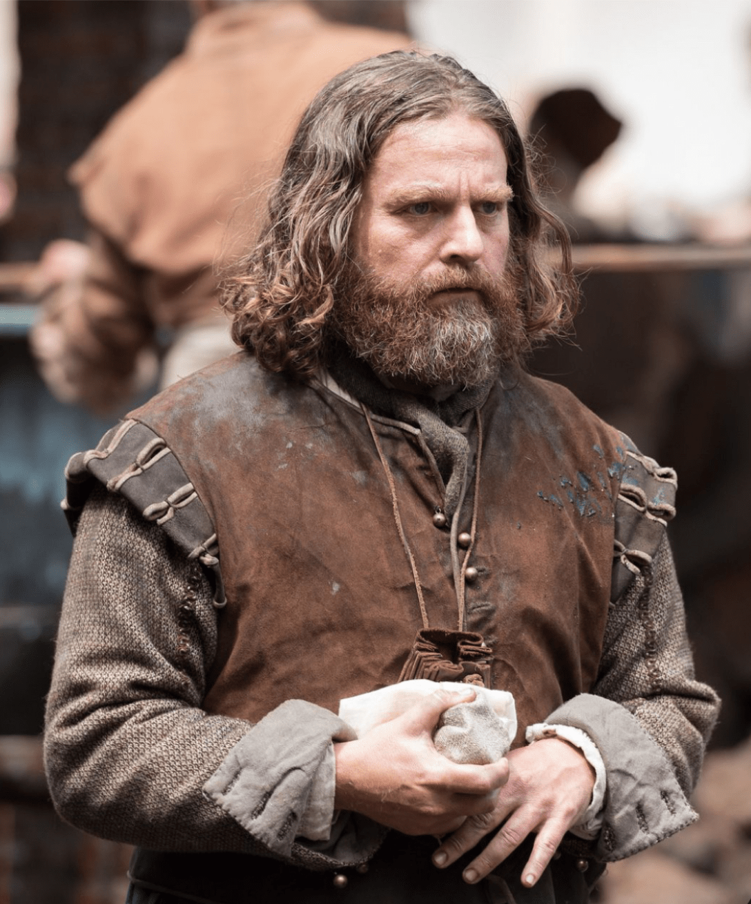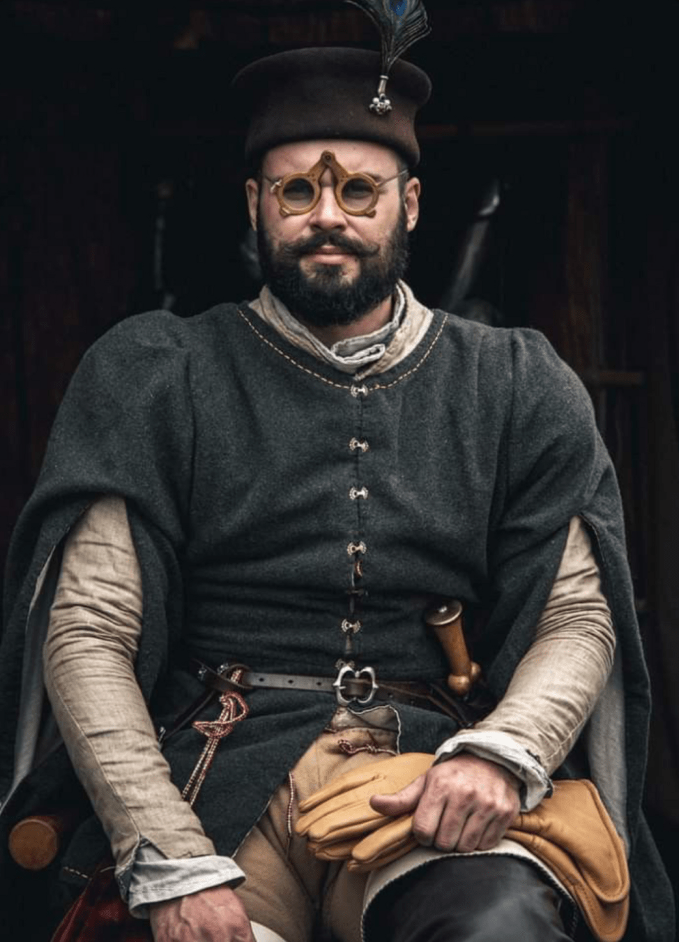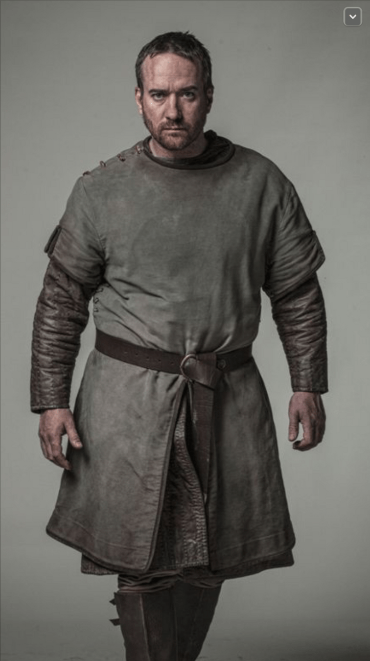 Túnica corta de trabajo (gambesón o cotta corta). De lino grueso o lana basta, sin teñir (blanco sucio, marrón claro, gris, ocre).