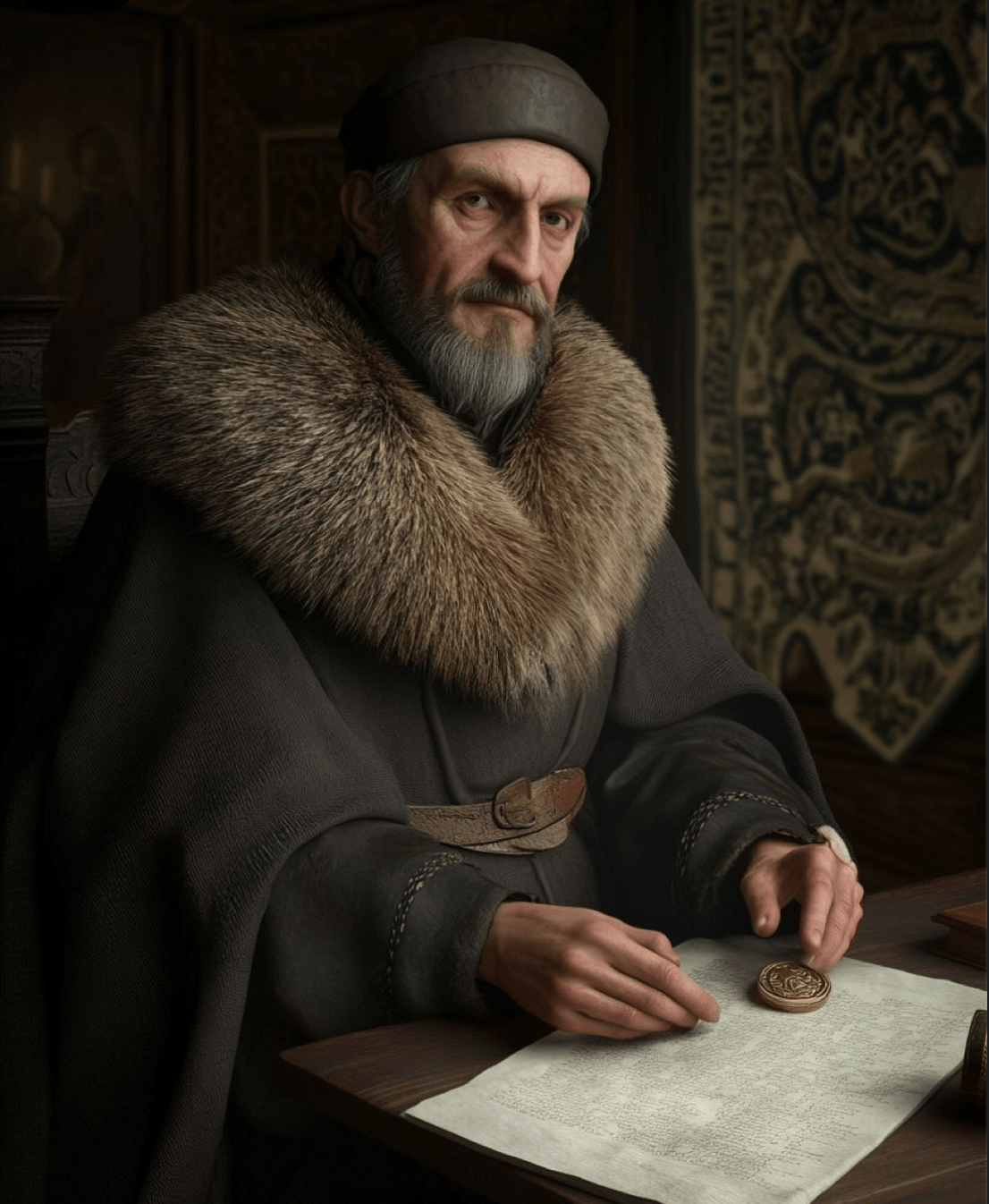 Un arquitecto en la Toscana del siglo XII vestiría de forma claramente diferenciada de un albañil, pero sin llegar al lujo de la nobleza. Este personaje tendría una apariencia cuidada pero práctica, con prendas más refinadas, mejores tejidos y algunos símbolos de autoridad técnica y espiritual.