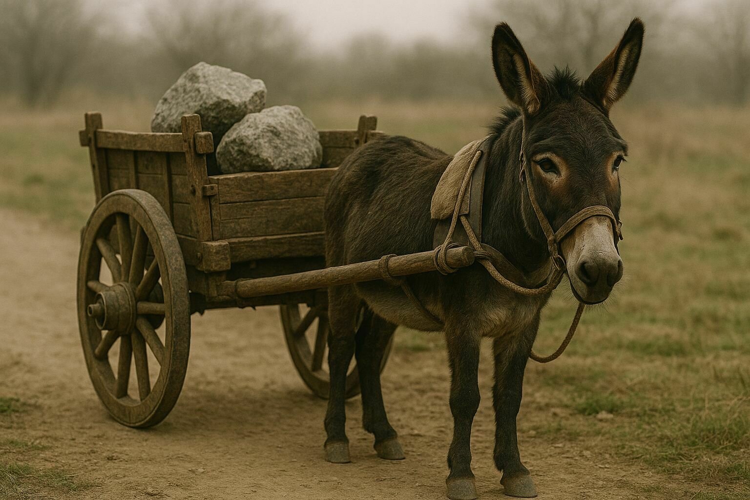 Hay elementos en el entorno que nos sugieren que estamos en un sitio donde se está llevando a cabo una obra: piedras de construcción, carretillas de madera, herramientas... Un pequeño muro a medio construir. Un viejo sistema de poleas para carga...