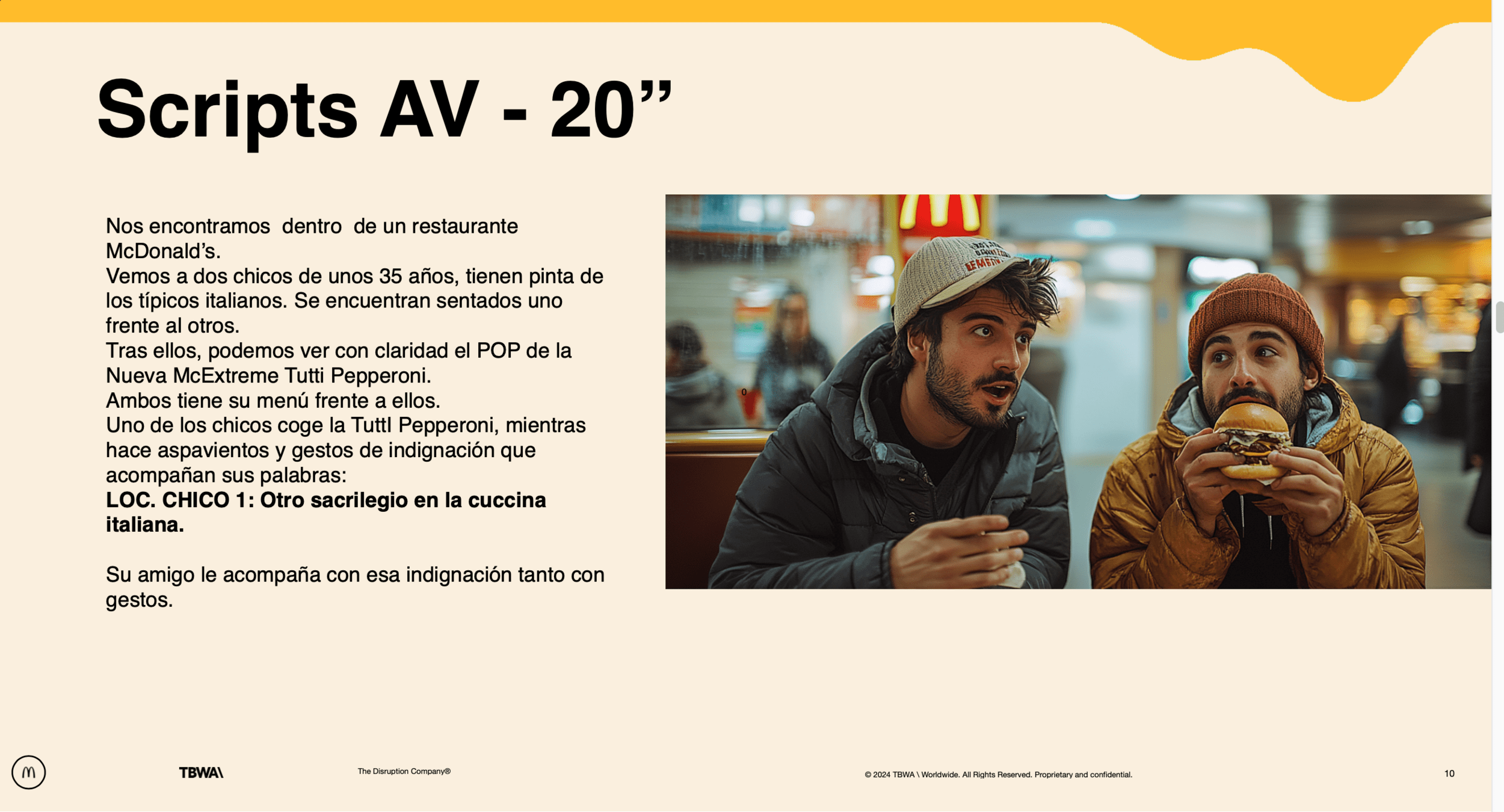 Y nos despedimos con un un simpático momento de consumo. Molaría que en el Feel Good Moment veamos a los dos amigos mordiendo sus hamburguesas con lágrimas en los ojos de felicidad. Y como reminiscencia "mágica" del momento wow, podrían volver a aparecer las luces de contra con la bandera italiana.