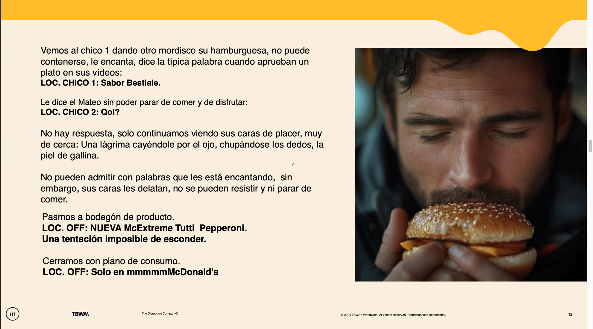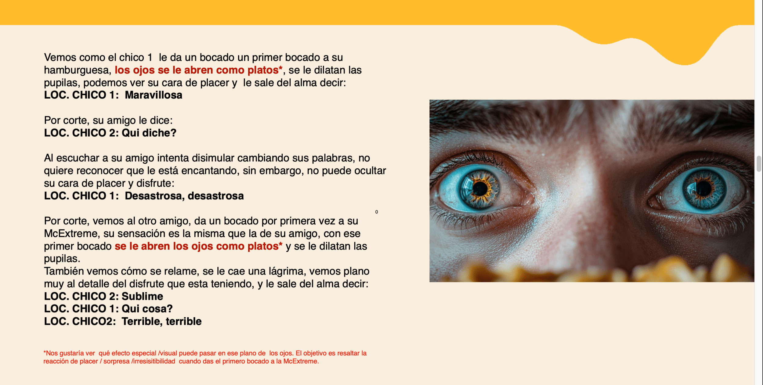 ¡Con el mordisco se pone en marcha el Efecto Wow! Un push in de cámara nos lleva a un plano corto de sus ojos, que se abren como dos soles y en los que vemos reflejada la imponente McEXTREME Tutti Pepperoni. Un gesto de sorpresa que va acompañado de una subida de cejas espectacular. No puede evitar que se le escape una palabra, susurrada con deleite.