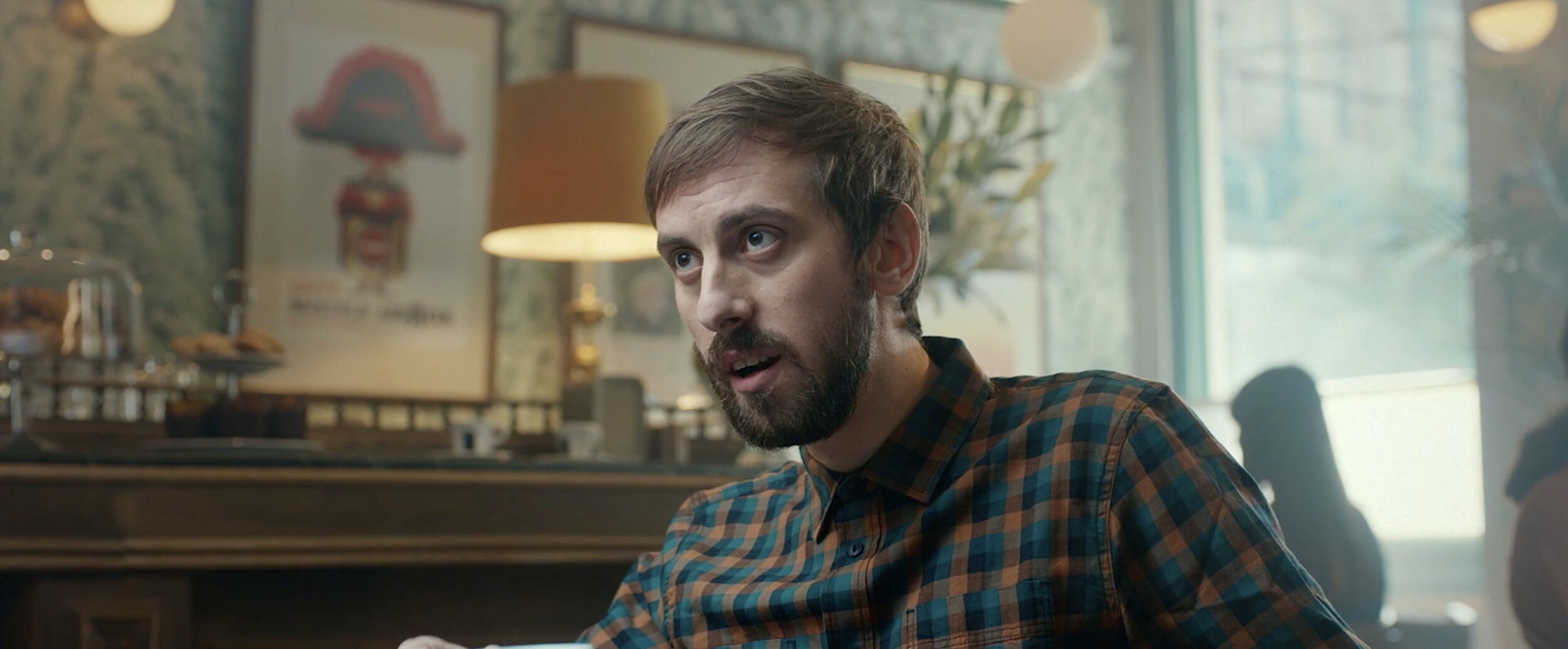 Arrancamos con pulso cinematográfico, la cámara sobrevuela en diagonal mesas con clientes hasta plantarse delante de la mesa que comparten nuestra pareja de protagonistas, sentados uno enfrente del otro. Vemos que miran con gesto serio serio su hamburguesa, y van a cogerla.