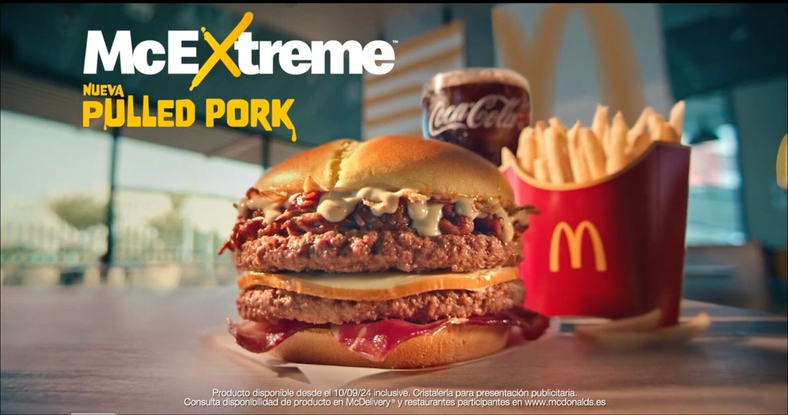 Cortamos al bodegón de producto en el que vemos la nueva McExtreme Tutti Pepperoni, las patatas McShaker Fries y una Coca Cola
