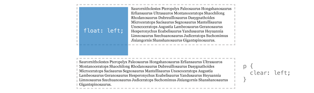 Les valeurs possibles sont none (par défaut), left (l’élément passe en dessous des flottants à gauche), right