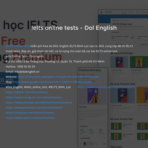 IELTS Online Tests miễn phí free do DOL English IELTS Đình Lực tạo ra. DOL cung cấp đề thi IELTS mock tests, đáp án, giải thích chi tiết, và từ vựng cho toàn bộ các bài IELTS online test. Ielts Online Test - Dol English Địa chỉ: 458/14 Ba Tháng Hai,