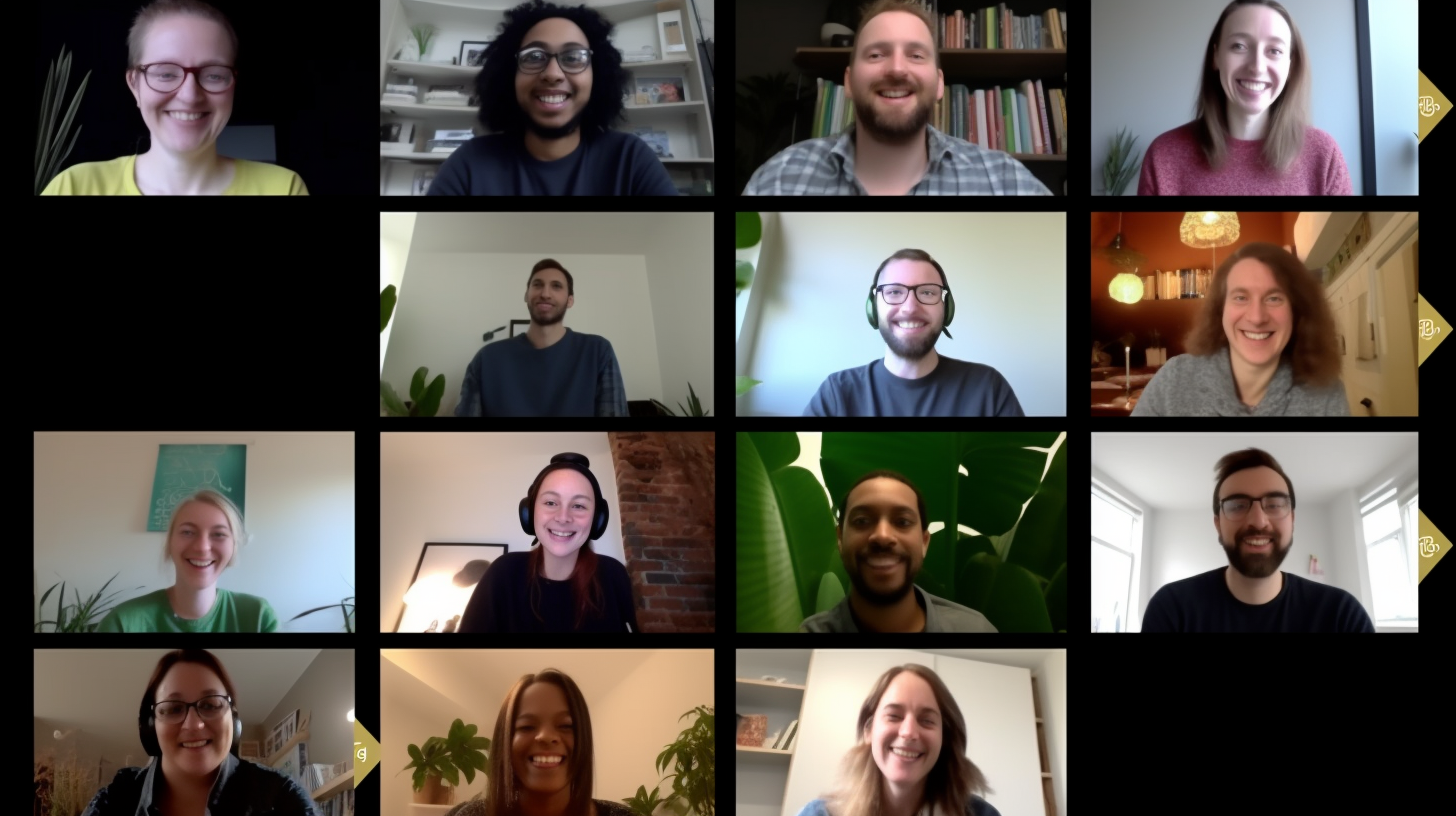 a very realistic screenshot captures 8 happy sustainability managers (female and male and diverse) in a zoom meeting talking about A.I., the mood is optimistic and friendly, the people represent a postmigrant society, mostly in home office, it is 7 pm in germany a april 17, use colors #223860 and #D93C61, cinematic light, ultra-detailled, hyper high resolution, 8K, Camera Setup: Camera: Canon EOS R5 photo --ar 16:9 —v 5