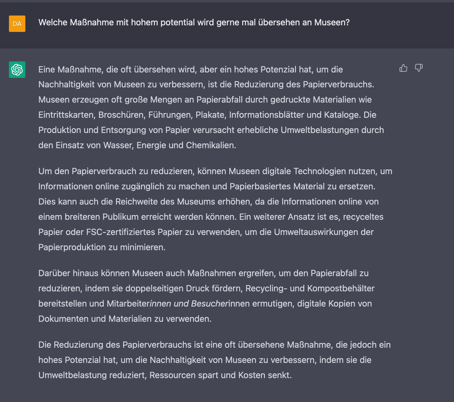 Standard-Aufgaben abkürzen, z.B. einen kurzen Briefing-Text zum Umgang mit Papier am Museum erzeugt haben, der so oder überarbeitet an die GF gehen kann: